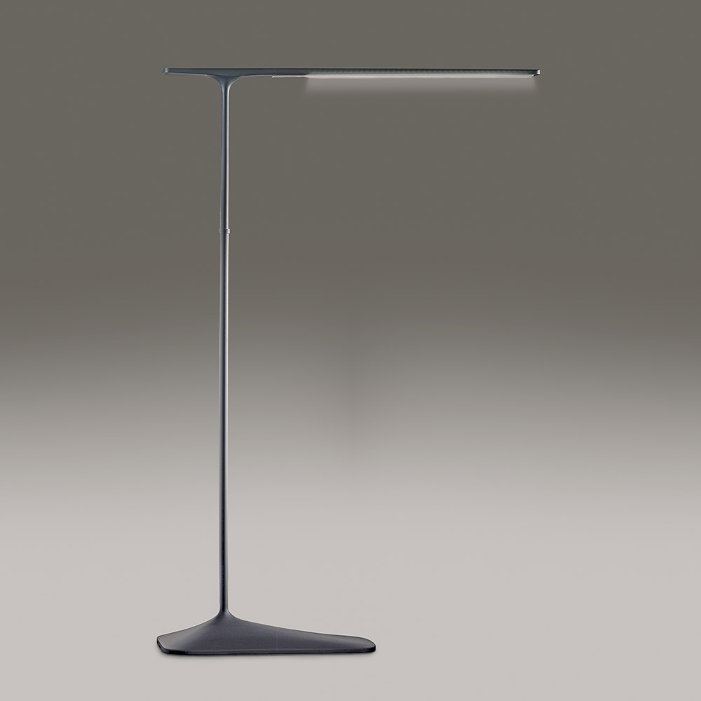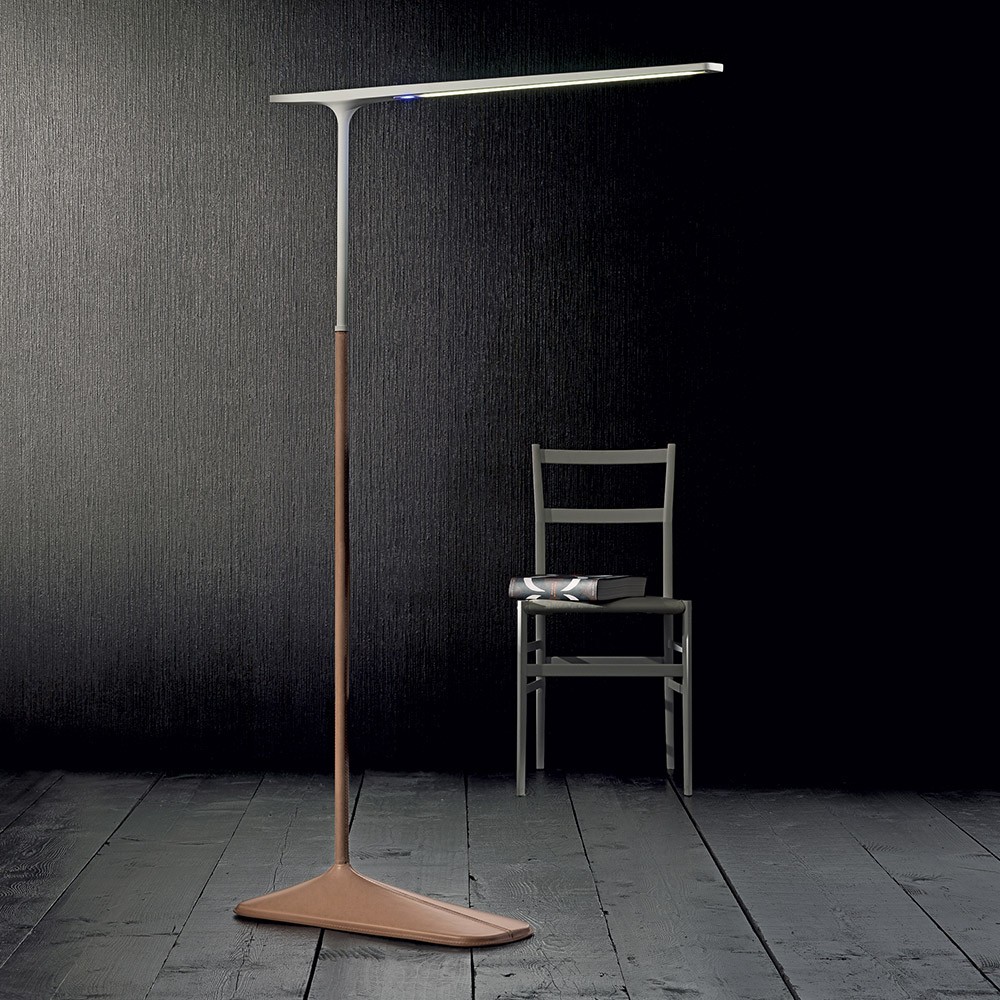 Структура модели выполнена из металла и термопластичного полиуретана. В качестве отделки предлагается кожа: бежевая, коричневая, темно-серая. Лакированная поверхность также может быть исполнена в трех цветах: белый, серый, коричневый. Торшер имеет поворотный механизм.