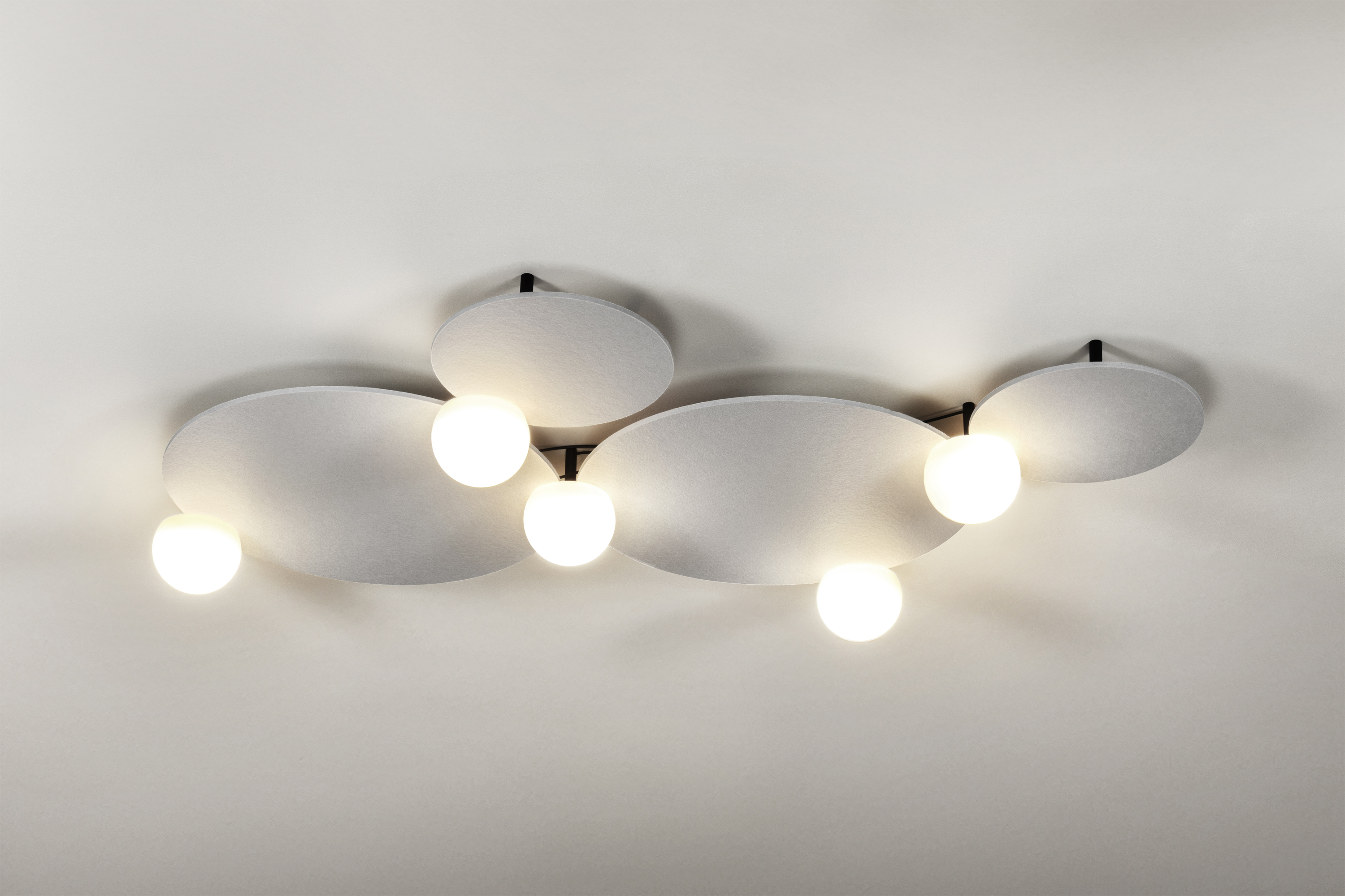 Особенностью этого светильника являются акустические панели, которые работают в сочетании со светом и создают визуальное и акустическое ощущение декоративного облака. Они помогают снизить уровень шума, делая атмосферу в помещении более комфортной. Акустические панели устанавливаются заподлицо с потолком, что позволяет сохранить эстетичный вид интерьера и не перегружать пространство.