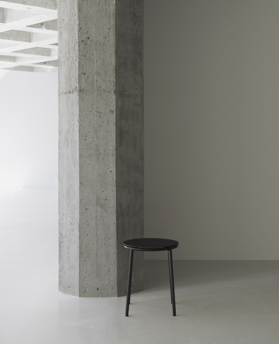 Стул предлагает несколько вариантов сиденья: круглый дубовый шпон, чёрный алюминий или обивка из ткани и кожи. Это позволяет адаптировать мебель под разные стили интерьера — от лофта до минимализма.