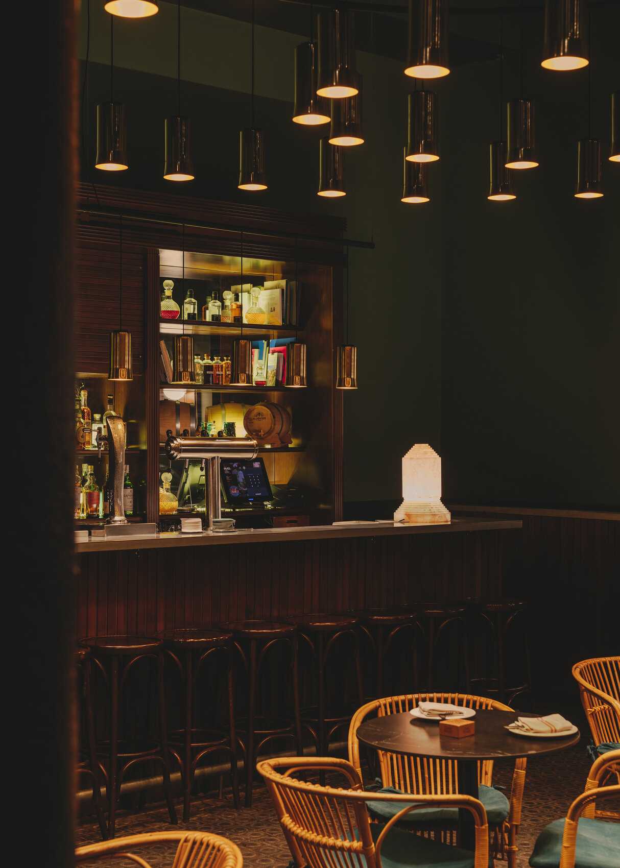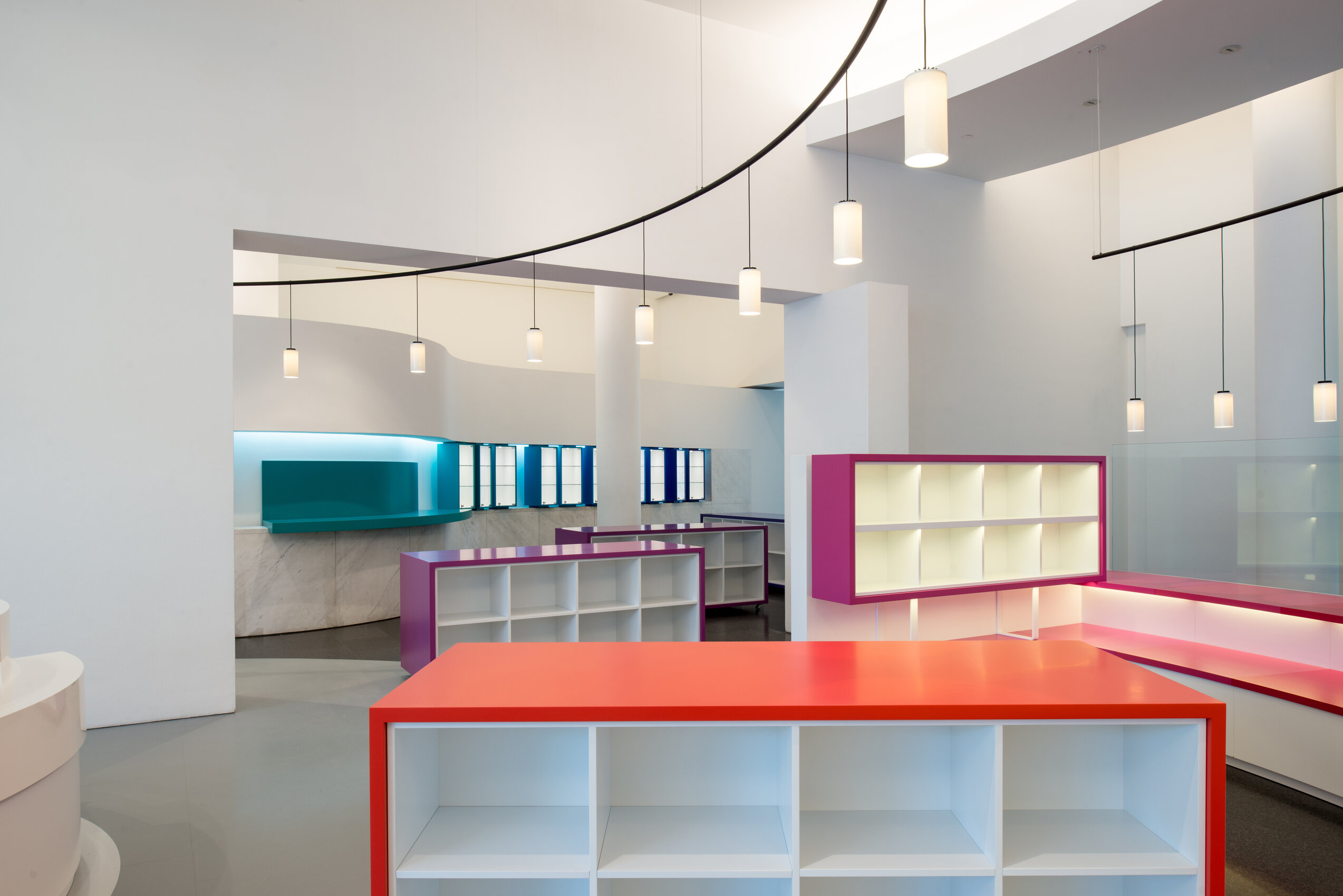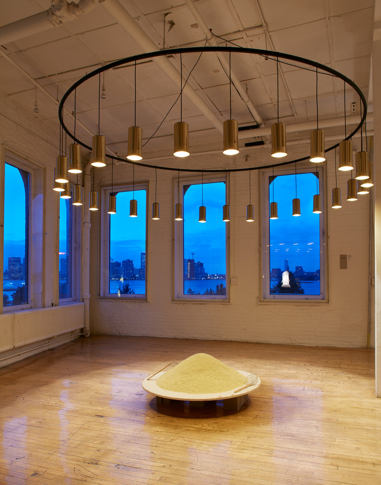 Абажуры выполняются в трёх вариантах из разных материалов. Белый фарфор придаёт свету тёплый, чуть янтарный оттенок, создавая уютную атмосферу. Белое опаловое стекло даёт более интенсивный световой поток, при этом свет остаётся мягким и рассеянным. Полированная латунь формирует направленный свет, который эффектно подчёркивает детали интерьера.