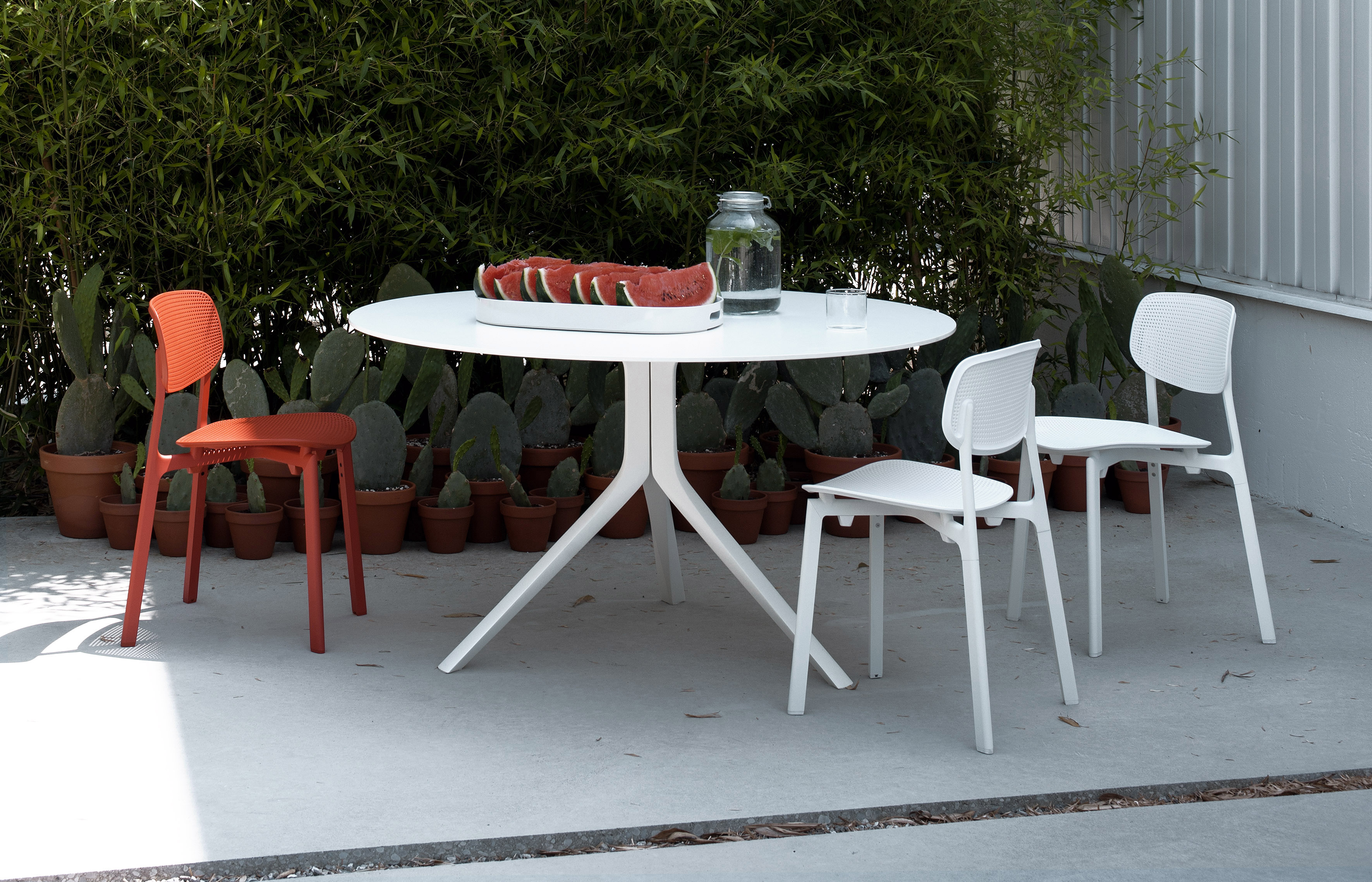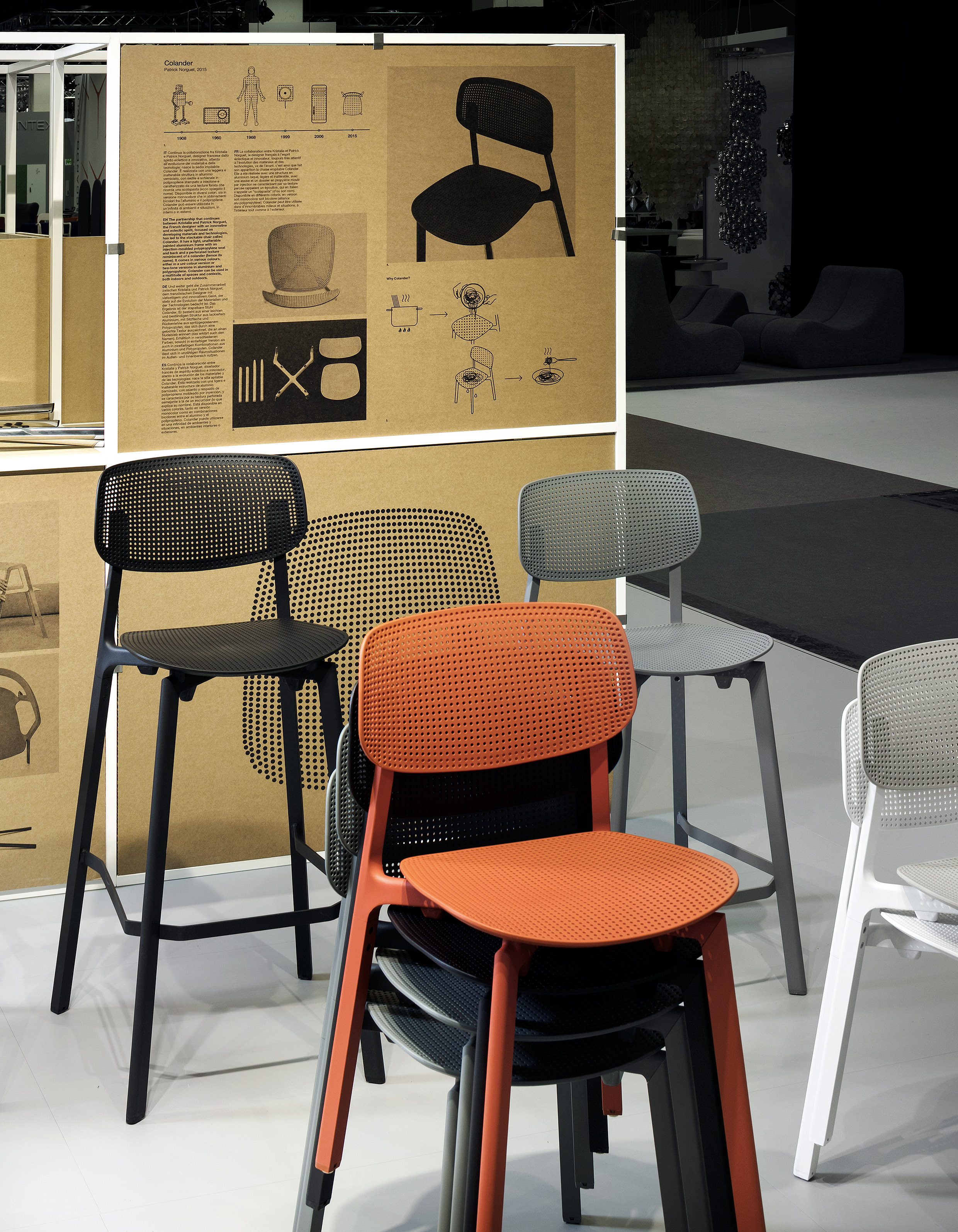 Ножки стула Colander изготавливаются из алюминия. Сиденье и спинка выполняются из полипропилена. Доступно две модели стула: однотонная и двухцветная. Однотонная модель полностью окрашивается в один цвет. У двухцветной сиденье и спинка имеет один оттенок, а ножки окрашиваются в белый или черный цвет. Подробнее о данной модели уточняйте у менеджеров или в PDF инструкции. n
