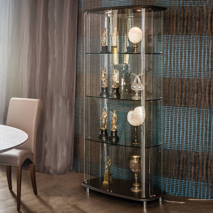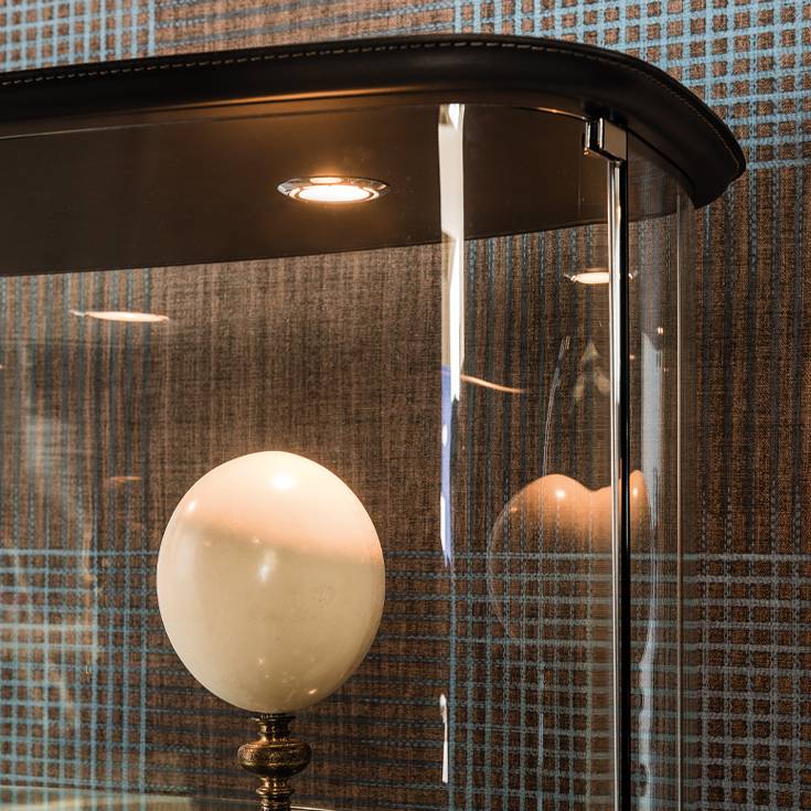 Конструкция из прочного прозрачного стекла обеспечивает полный обзор, в то время как основание и верхняя крышка, обитые кожей, придают витрине солидность и стилевую выразительность. Кожаная отделка открывает широкие возможности для персонализации: вы можете выбрать смелые яркие оттенки для создания акцентного элемента или спокойные нейтральные тона для достижения полной гармонии в интерьере.