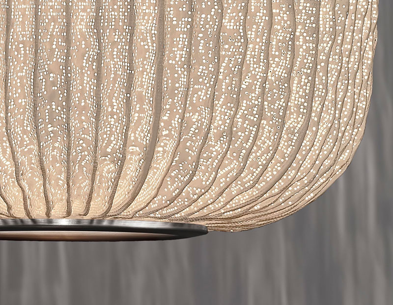 Основа светильника — окрашенная нержавеющая сталь. Материал прочный, а благодаря ручной работе каждый экземпляр получается особенным: плавные изгибы и объёмы выглядят очень естественно. Когда светильник включён, игра света и тени делает его ещё выразительнее.