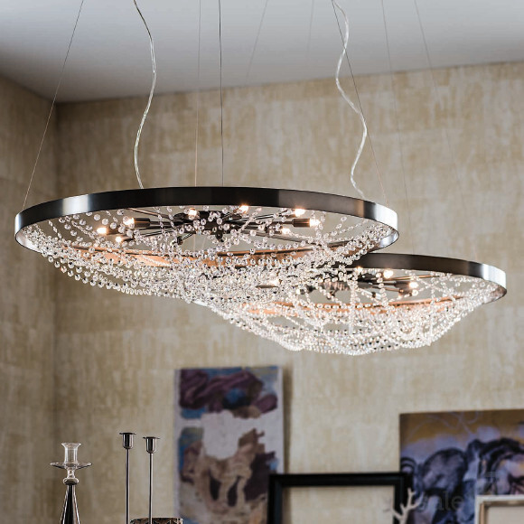 Элегантная подвесная люстра CRISTAL с никелированным плафоном-диском, от которого расходятся каскады хрустальных подвесов. Пересекающиеся струны со стразами создают игру света, напоминающую драгоценное украшение. Модель сочетает современные производственные технологии с ювелирной точностью деталей.