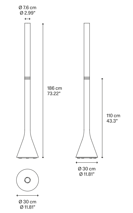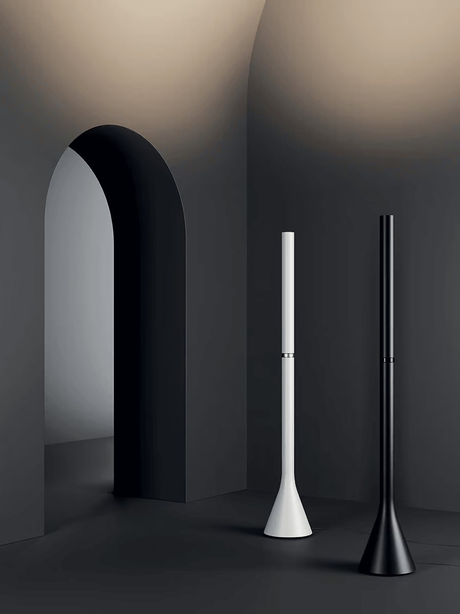 Напольная лампа общей высотой 186 см, спроектированная Лукой Никетто, опирается на коническое основание, обеспечивающее устойчивость, из которого поднимается вытянутый стержень, почти исчезающий в луче света, производимом источником светодиодного излучения. Кольцо, расположенное на середине ноги торшера, позволяет пользователю включать и выключать светодиодный модуль и управлять функцией dim-to-warm в диапазоне от 2200 до 3200 Кельвин.