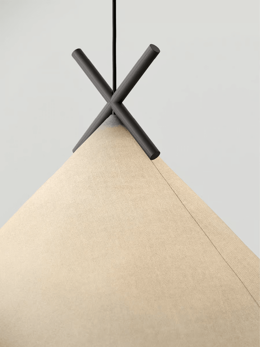 Центральным элементом лампы является конический тканевый диффузор, создающий мягкий, рассеянный свет, который наполняет помещение теплом и уютом. Особенностью конструкции служит уникальная опорная структура в форме буквы «Х», выполненная из металла черного цвета. Этот элемент не только придает композиции дополнительную устойчивость, но и выступает выразительным декоративным штрихом, привлекающим внимание своей лаконичностью и точностью линий.