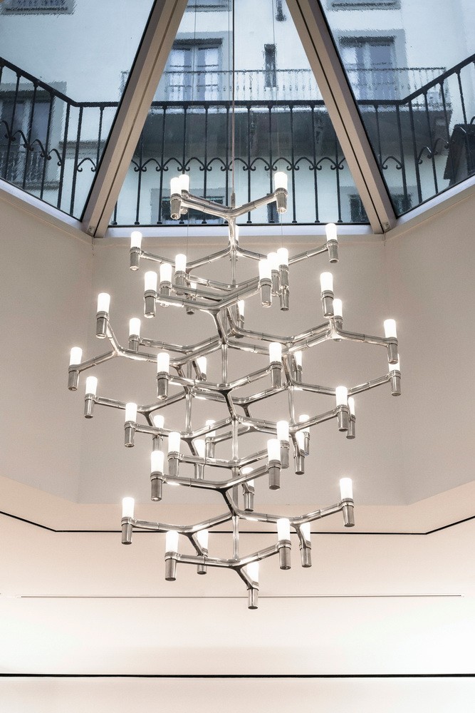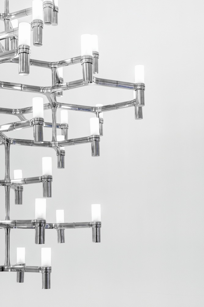 Подвесная люстра с модульной структурой из штампованного алюминия и стеклянными плафонами. Конструкция из алюминия с ручной полировкой, доступна в нескольких цветах: золотом, белом, черном и хромированном. Все светильники коллекции Crown обеспечивают широкое распространение света.