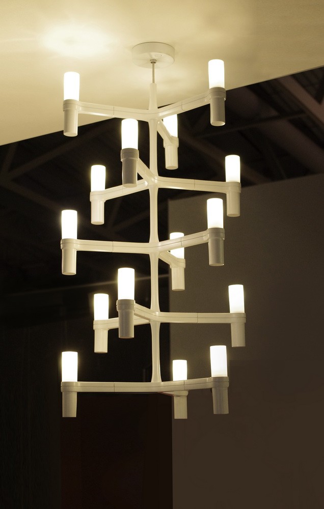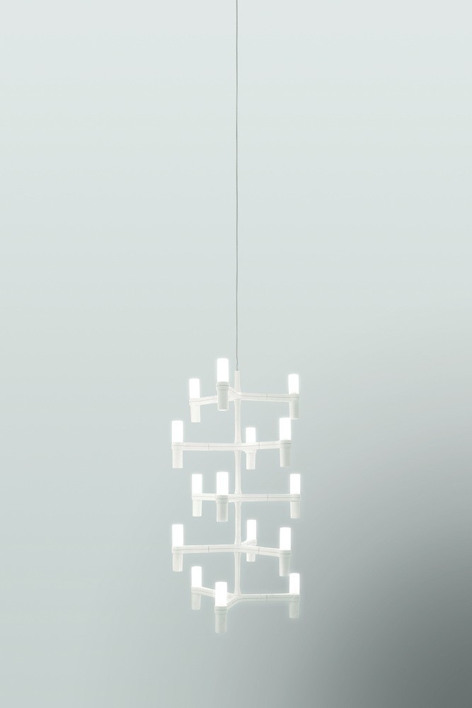Подвесная люстра с модульной структурой из штампованного алюминия и стеклянными плафонами. Конструкция из алюминия с ручной полировкой, доступна в нескольких цветах: золотом, белом, черном и хромированном. Все светильники коллекции Crown обеспечивают широкое распространение света.