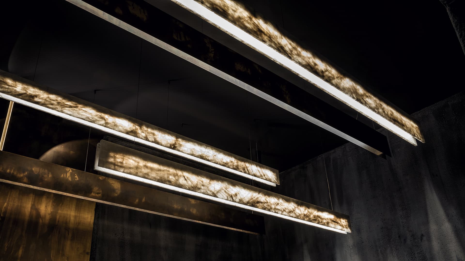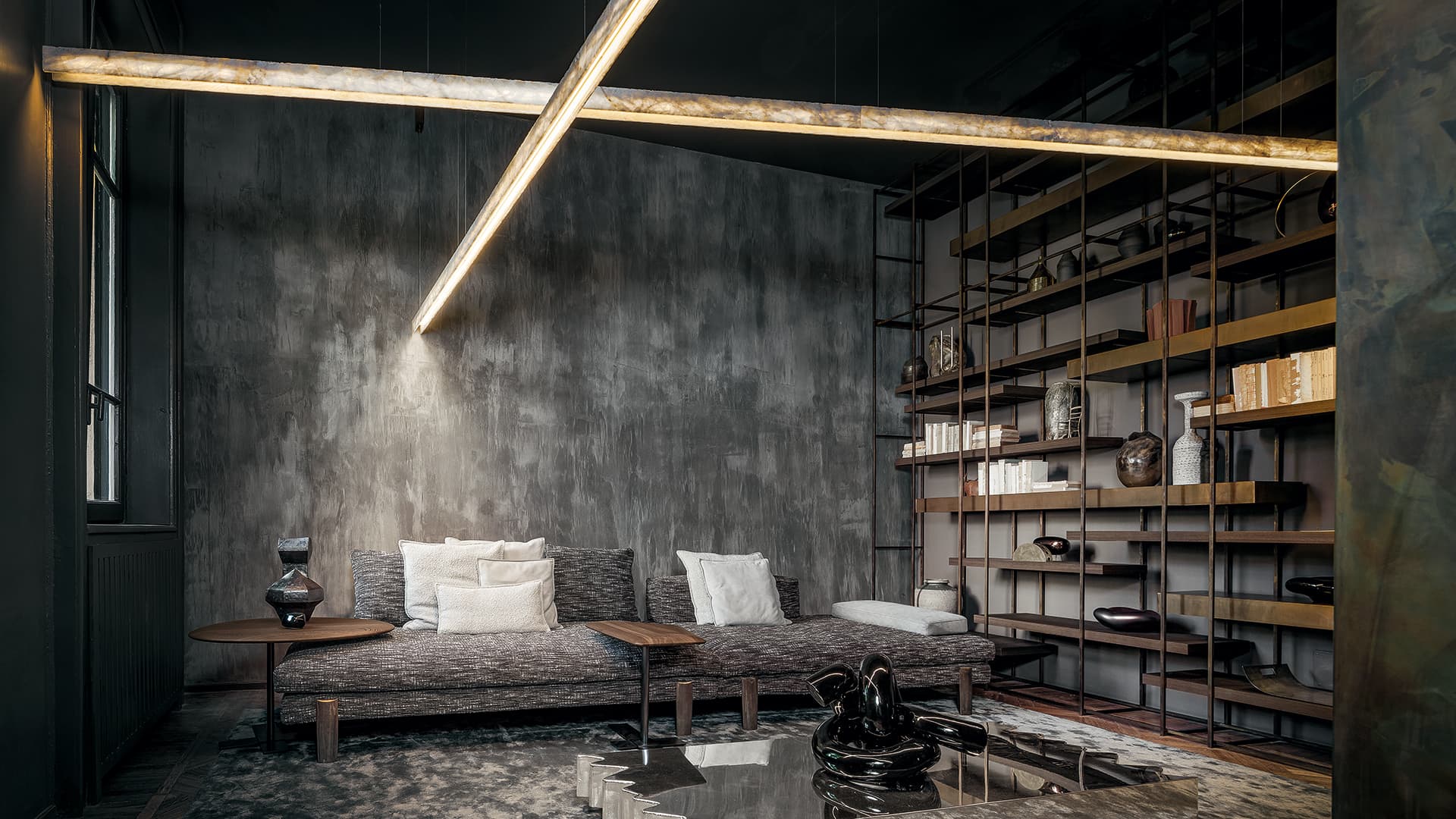 Центральный источник света, выполненный из белого хрусталя, становится смысловым и энергетическим ядром композиции. Его холодное, кристально чистое свечение контрастирует с тёплым вариантом подсветки (2700 К). Предлагается выбор между сдержанной элегантностью и уютной атмосферой. В альтернативном исполнении — с полированной платиной или титаном — светильник приобретает ещё более драматичный характер. Металлические блики усиливают глубину и сложность восприятия.