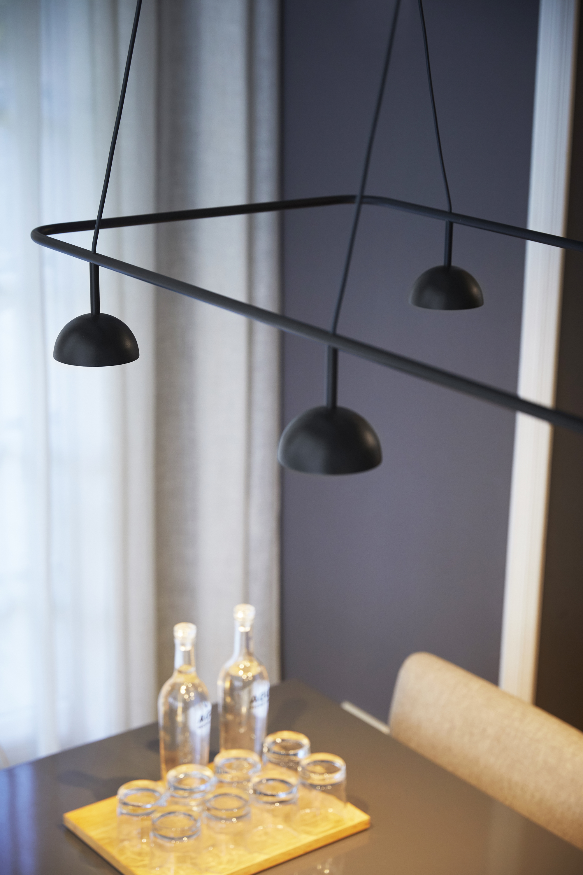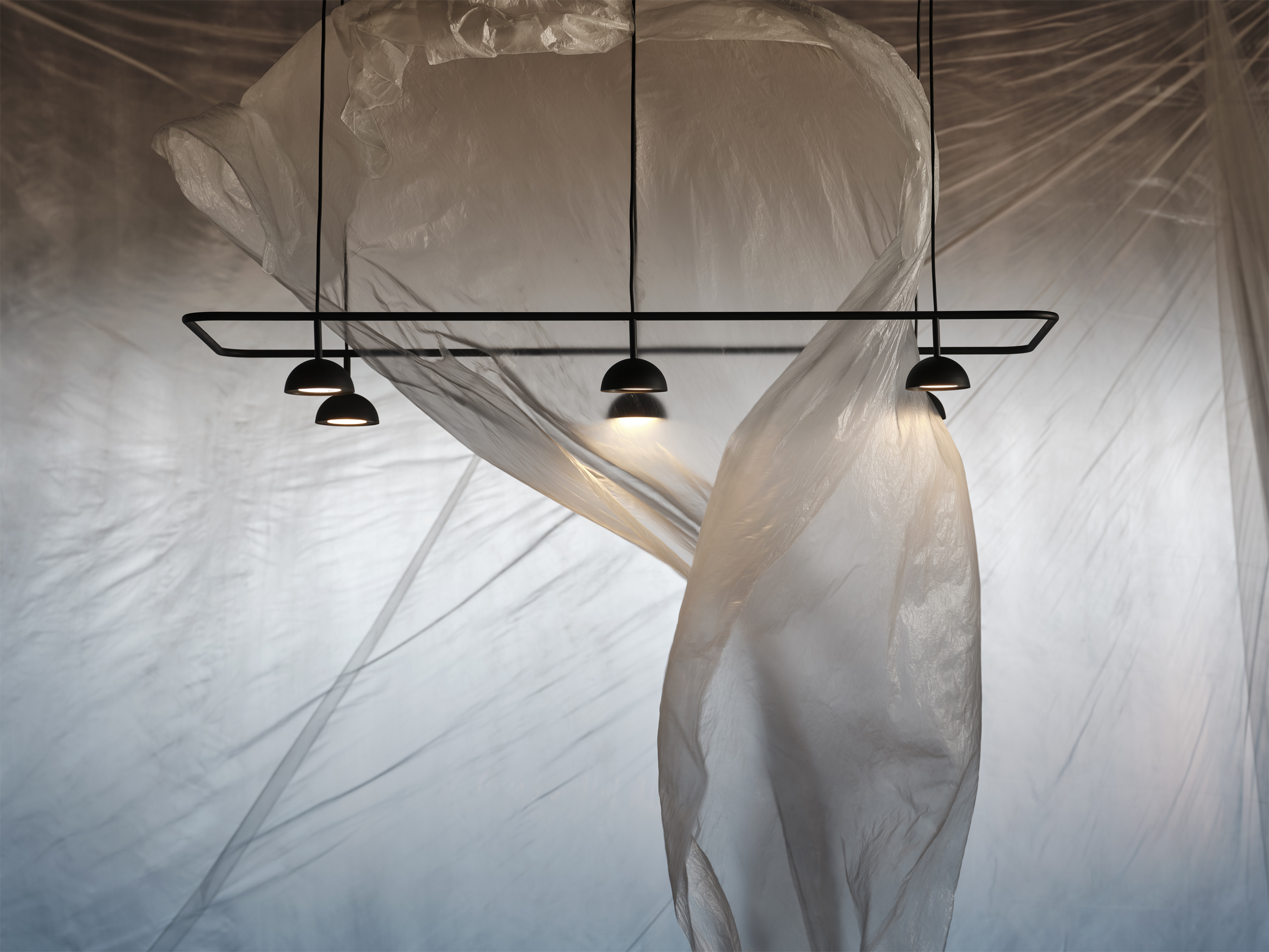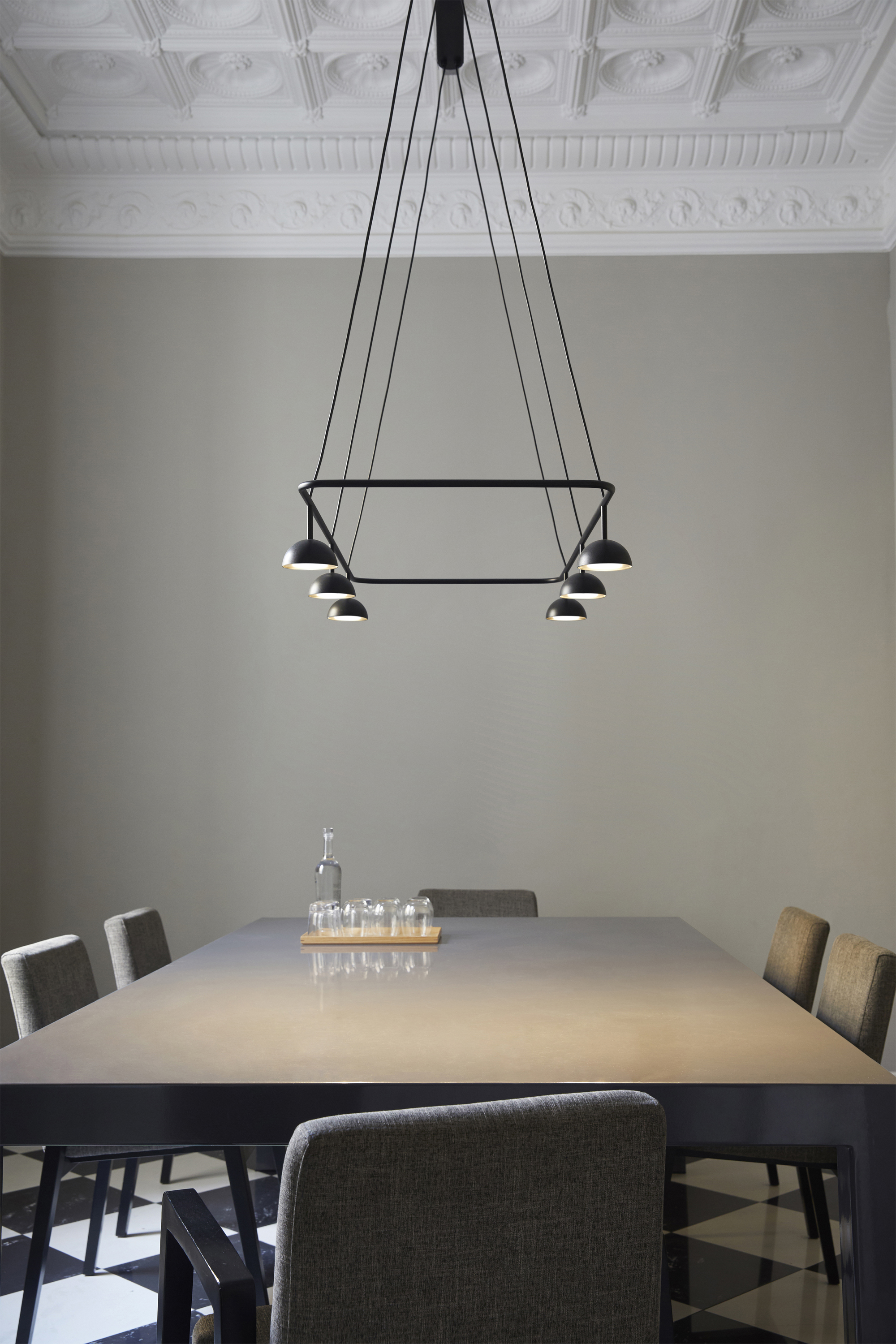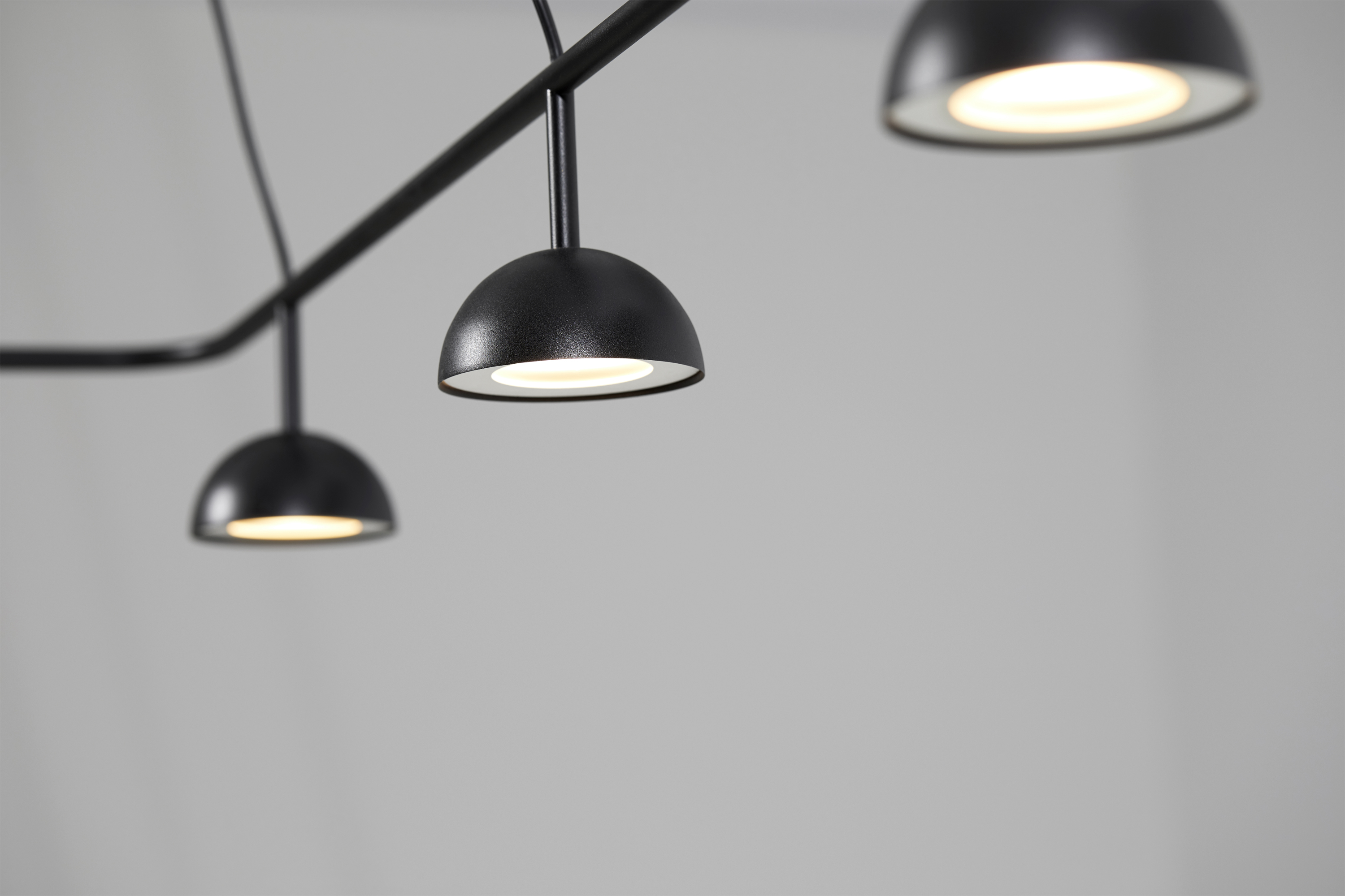 Модель с шестью лампами имеет прямоугольный металлический корпус со сглаженными краями. Её украшают алюминиевые купольны́е плафоны, а акриловые рассеиватели делают свет мягким и равномерным. Благодаря встроенным светодиодам с регулировкой яркости можно легко менять интенсивность освещения. Светильник крепится к потолку с помощью индивидуальной розетки, а высоту подвеса можно настраивать — максимум до 350 см. Выполнен он в чёрном цвете, который подходит для разных интерьеров. По желанию к нему добавляют декоративную панель с искусственными растениями — она не только украшает, но и помогает поглощать звук.