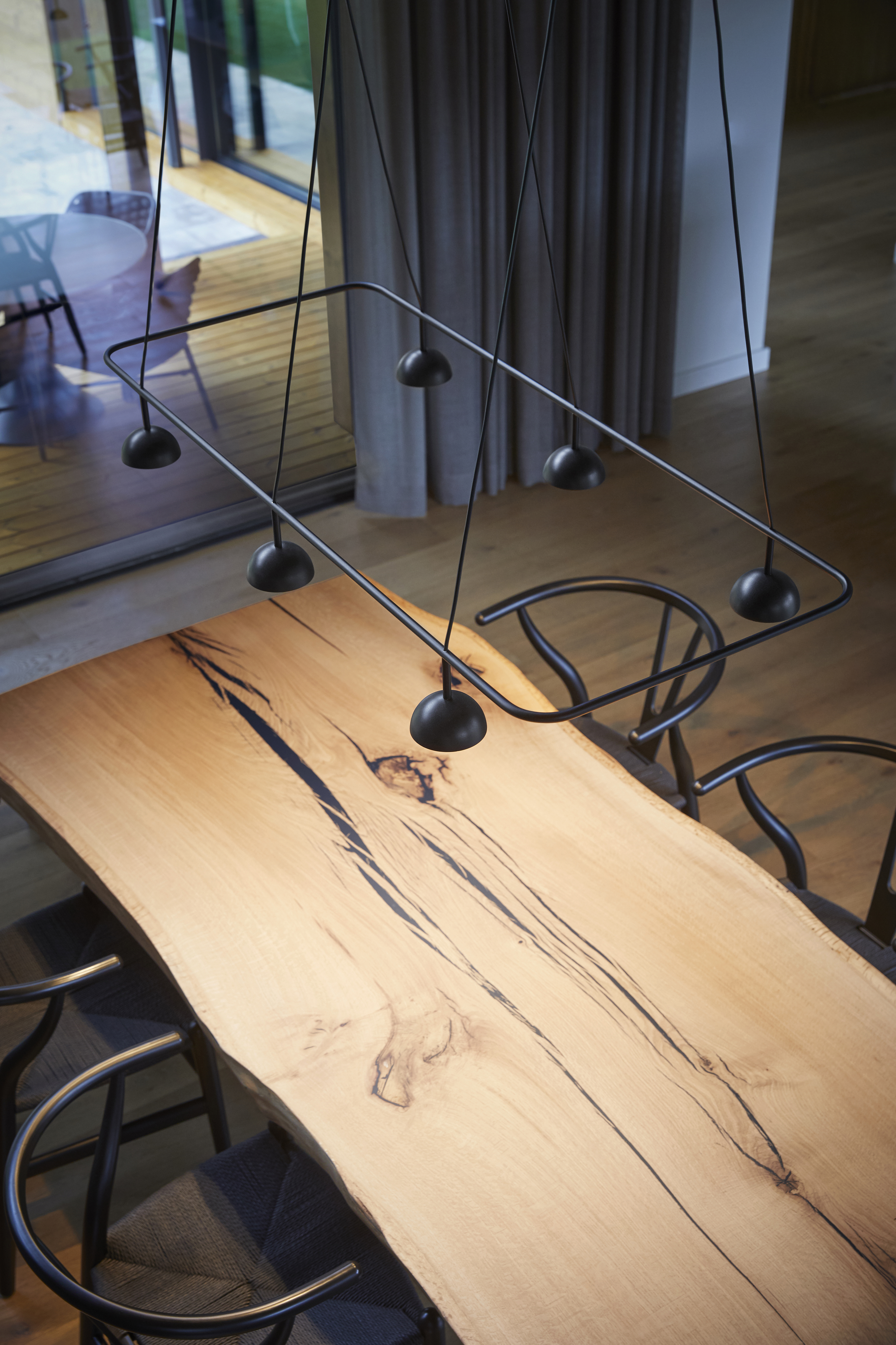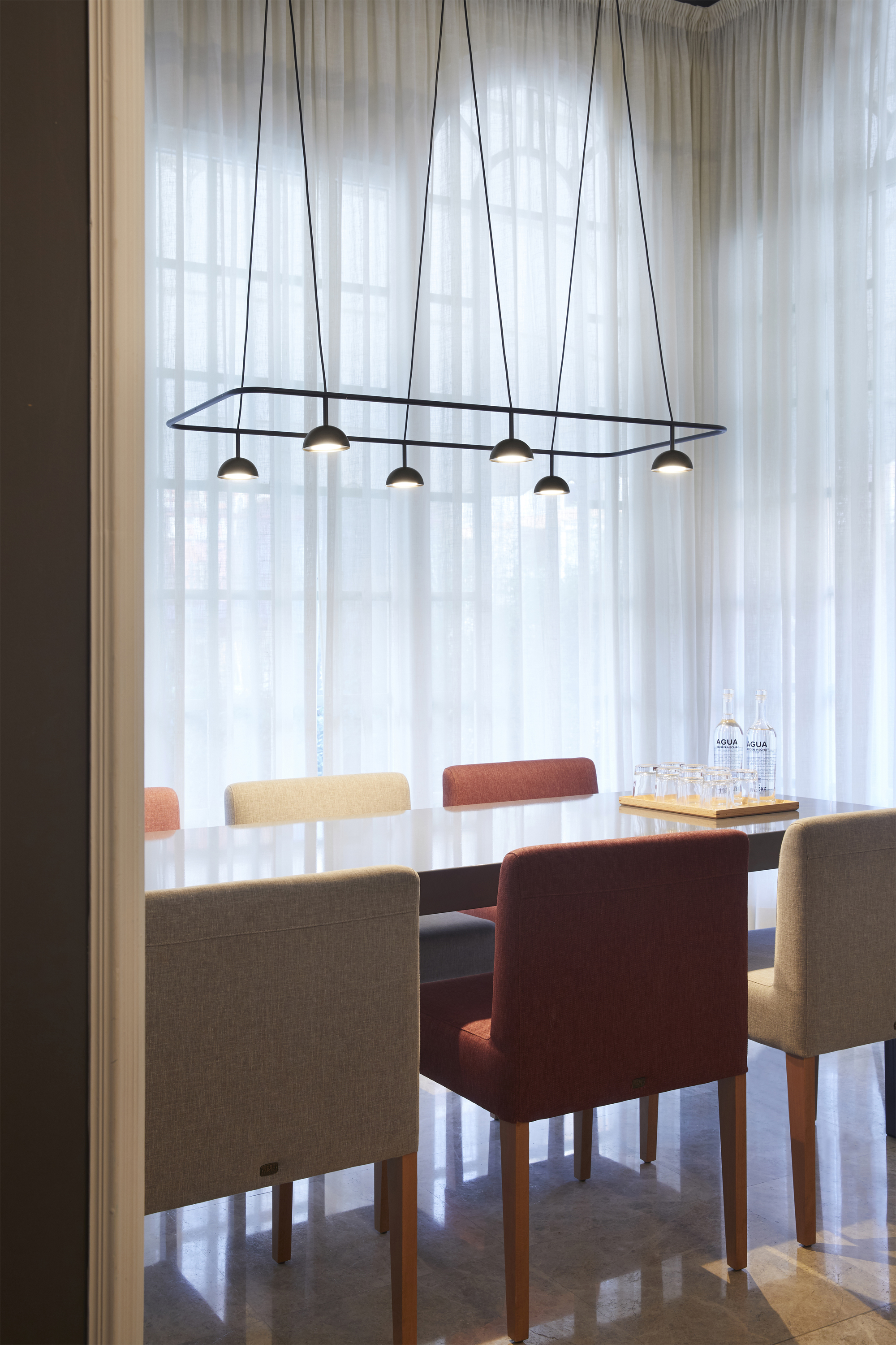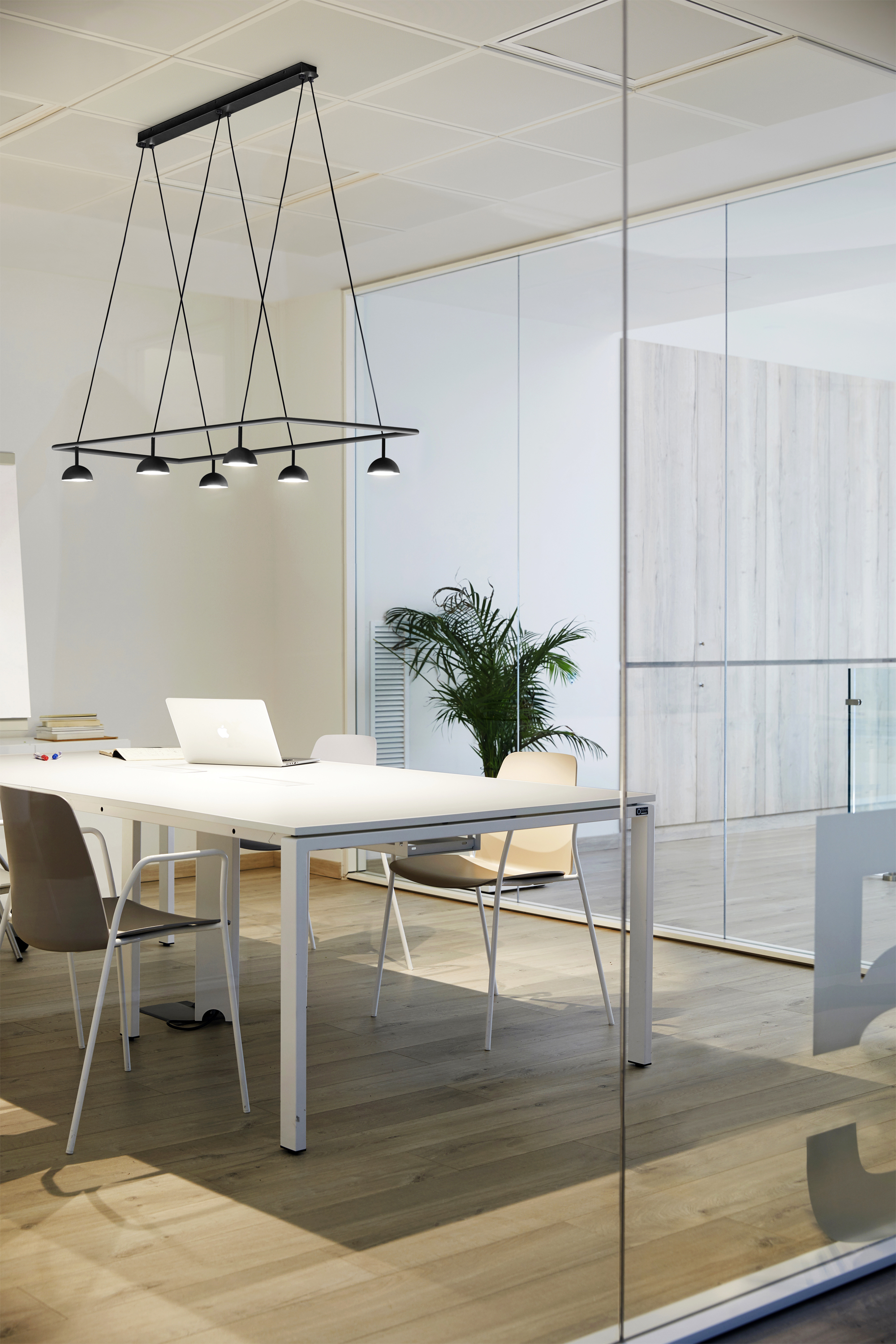 Модель с шестью лампами имеет прямоугольный металлический корпус со сглаженными краями. Её украшают алюминиевые купольны́е плафоны, а акриловые рассеиватели делают свет мягким и равномерным. Благодаря встроенным светодиодам с регулировкой яркости можно легко менять интенсивность освещения. Светильник крепится к потолку с помощью индивидуальной розетки, а высоту подвеса можно настраивать — максимум до 350 см. Выполнен он в чёрном цвете, который подходит для разных интерьеров. По желанию к нему добавляют декоративную панель с искусственными растениями — она не только украшает, но и помогает поглощать звук.