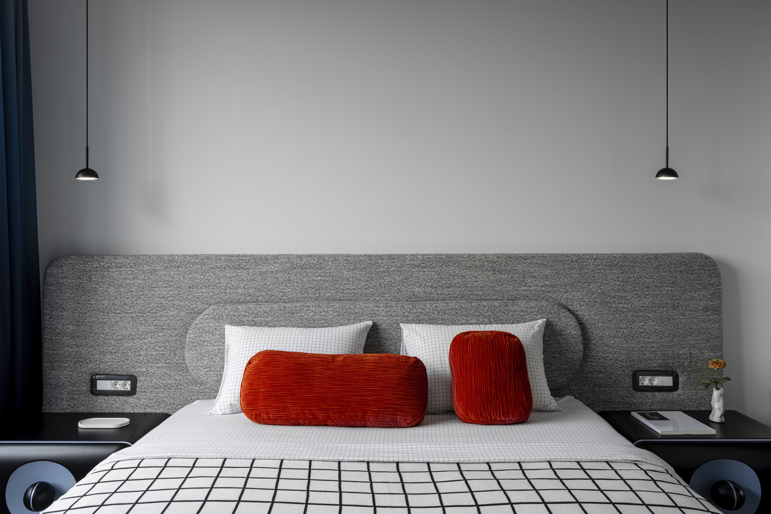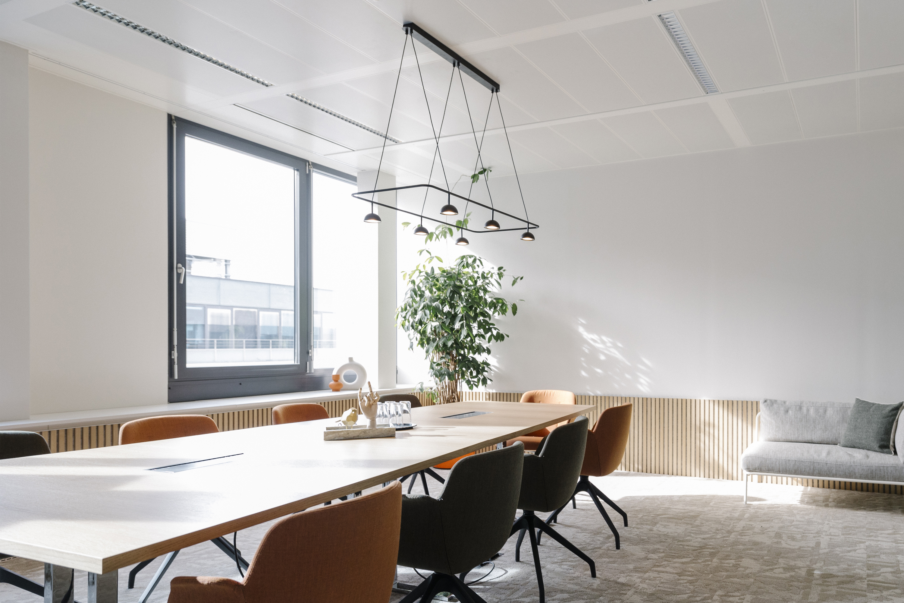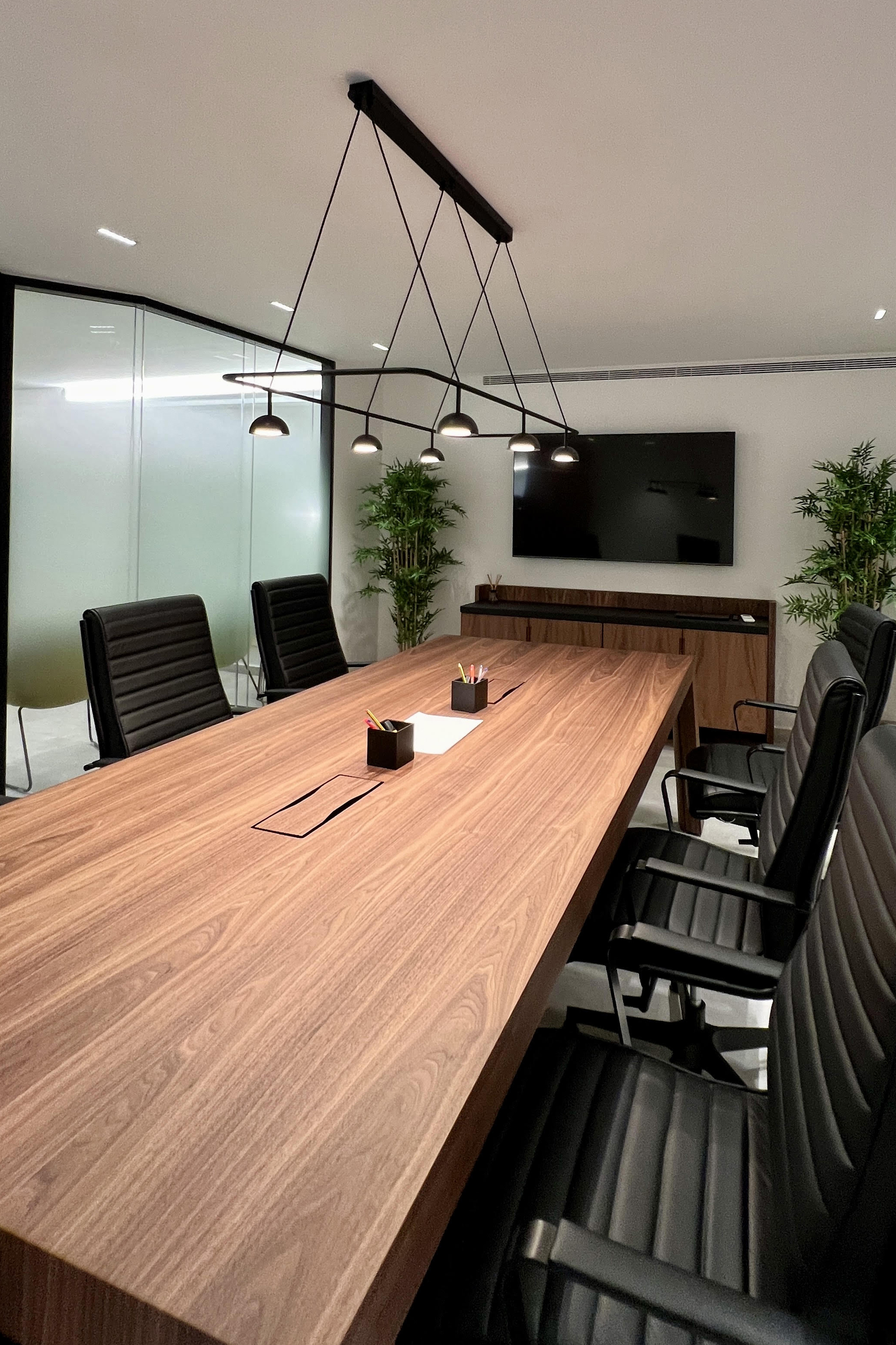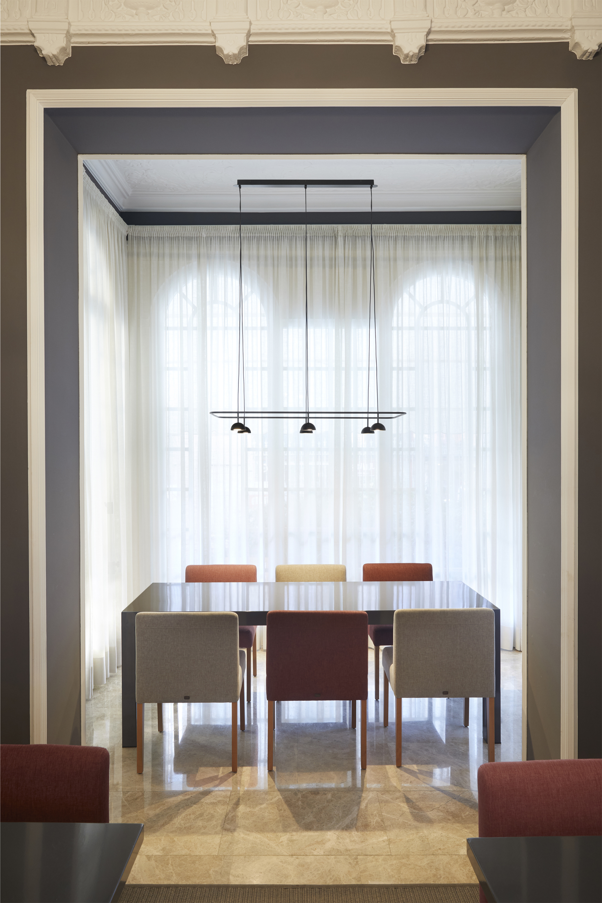 Модель с шестью лампами имеет прямоугольный металлический корпус со сглаженными краями. Её украшают алюминиевые купольны́е плафоны, а акриловые рассеиватели делают свет мягким и равномерным. Благодаря встроенным светодиодам с регулировкой яркости можно легко менять интенсивность освещения. Светильник крепится к потолку с помощью индивидуальной розетки, а высоту подвеса можно настраивать — максимум до 350 см. Выполнен он в чёрном цвете, который подходит для разных интерьеров. По желанию к нему добавляют декоративную панель с искусственными растениями — она не только украшает, но и помогает поглощать звук.