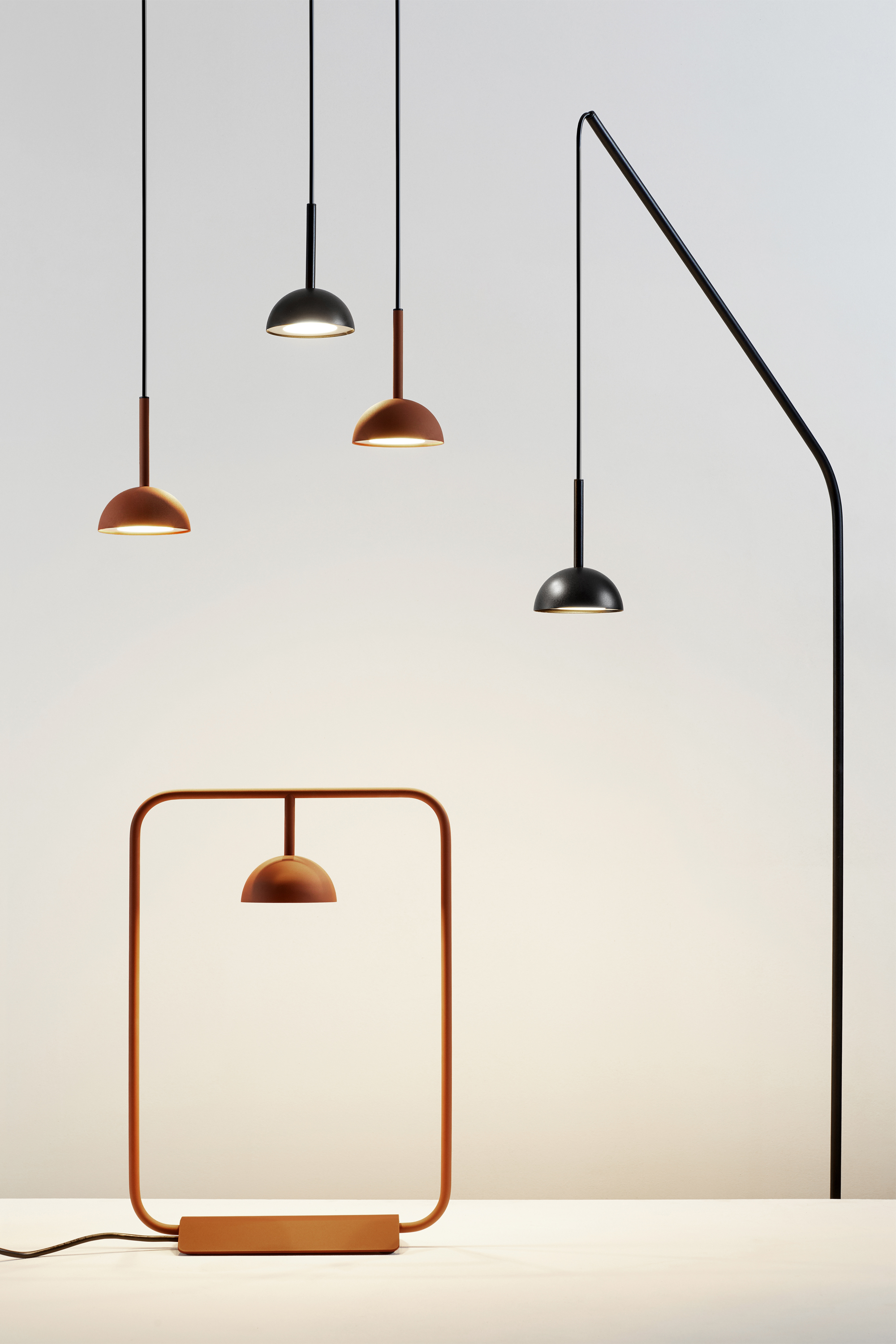 Есть также версия с одной лампой. Она выглядит так же стильно: металлический корпус, алюминиевый плафон и акриловый рассеиватель создают лаконичный образ. Высота подвеса регулируется до 300 см, крепление аналогичное. Этот вариант хорошо подходит для комбинирования с другими светильниками. Отличается он и цветовой гаммой: доступен не только в чёрном, но и в терракотовом цвете.