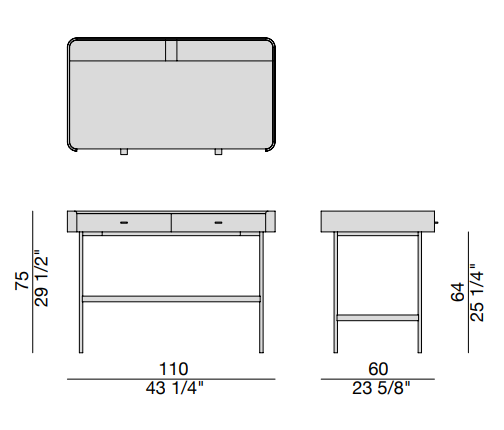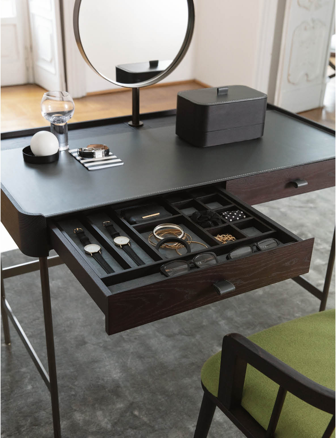 Низкие или высокие ящики с кожаными крышками придают столику дополнительную функциональность и эстетическую привлекательность. Поворотное зеркало встроено в конструкцию. Благодаря этому столик можно использовать не только как рабочую поверхность, но и как туалетный столик. Это делает его универсальным элементом интерьера.