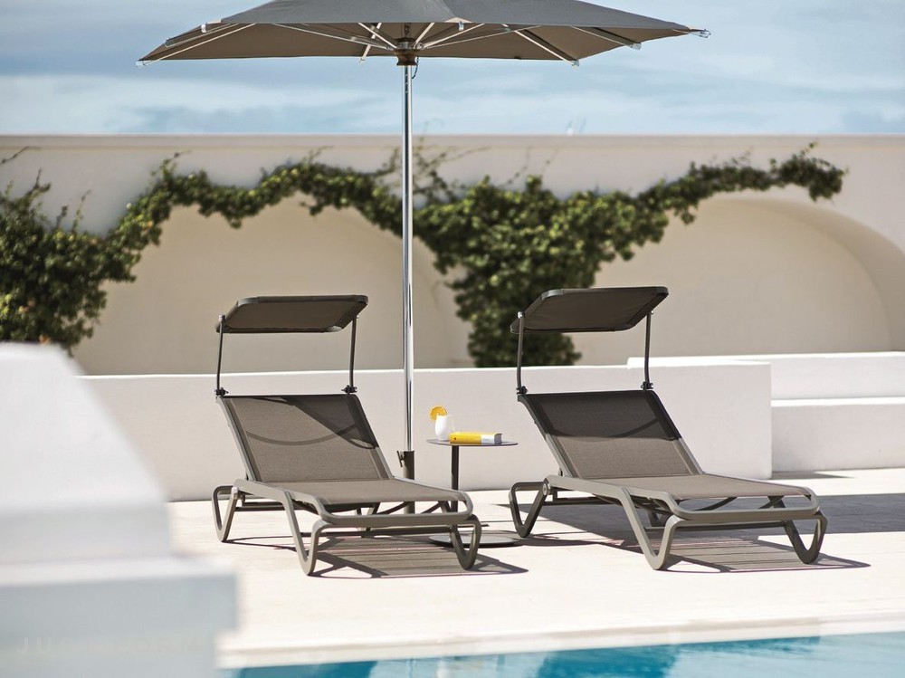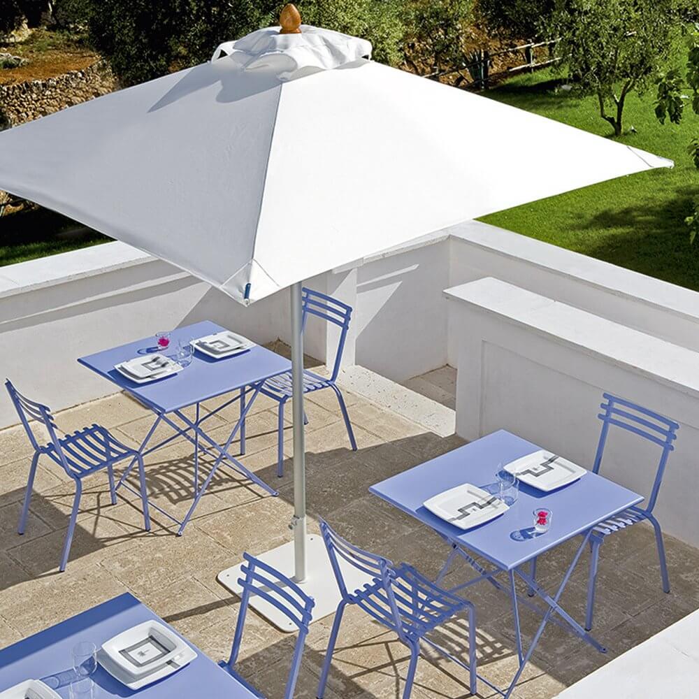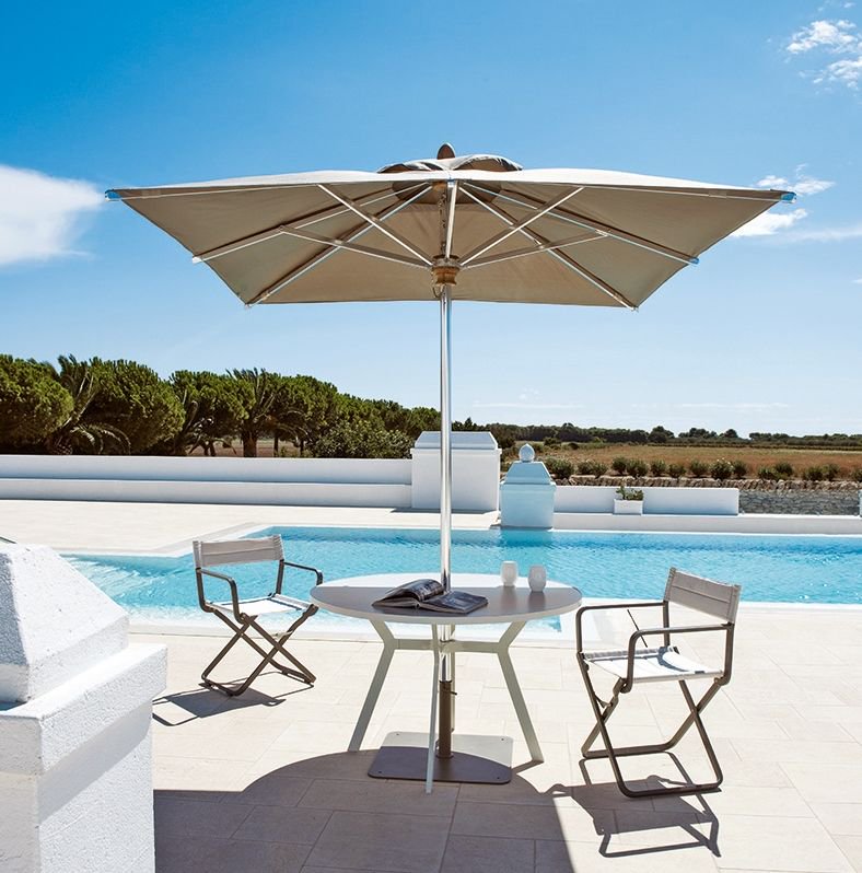 Dehors — квадратный зонт с центральной опорой, который прекрасно подойдет для сада, террасы или бассейна. Каркас модели производится из анодированного алюминия в двух цветах (серый и белый), а сам зонт из полиэстера белого цвета. Металлическая база, весом 30 килограмм, включена в стоимость. Зонт и база могут быть приобретены по отдельности. Утяжелительная база является универсальной и подходит для всех зонтов фабрики Ethimo. Дополнительно можно приобрести чехол от дождя. Более подробную информацию можно уточнить у менеджера.