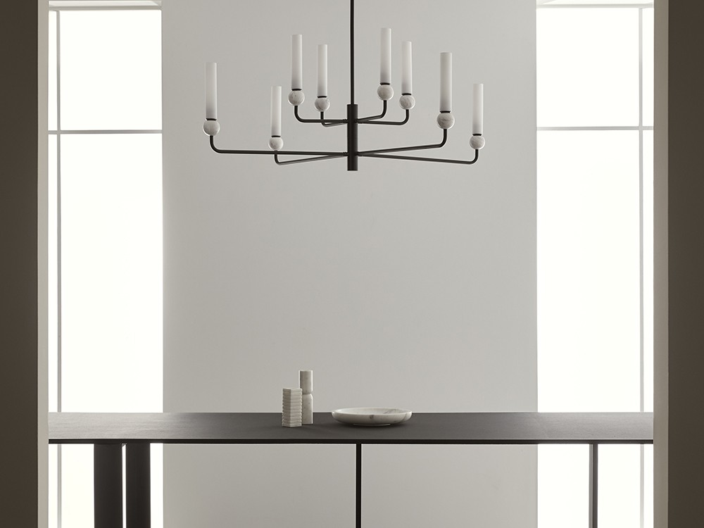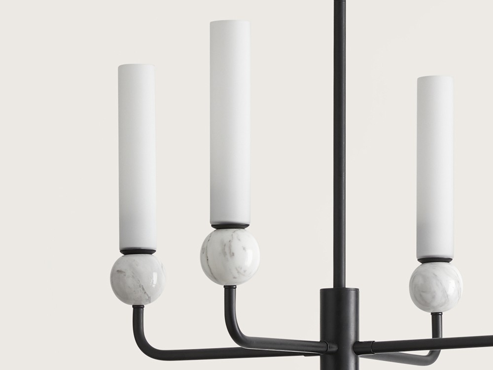 В конструкции светильника использованы сталь, выдувное стекло и мрамор. Металлическая арматура представлена в двух вариантах отделки: матовый черный и состаренное золото, что позволяет адаптировать светильник под различные стилистические решения. Плафоны выполнены из опалового стекла, обеспечивающего мягкое и рассеянное освещение.