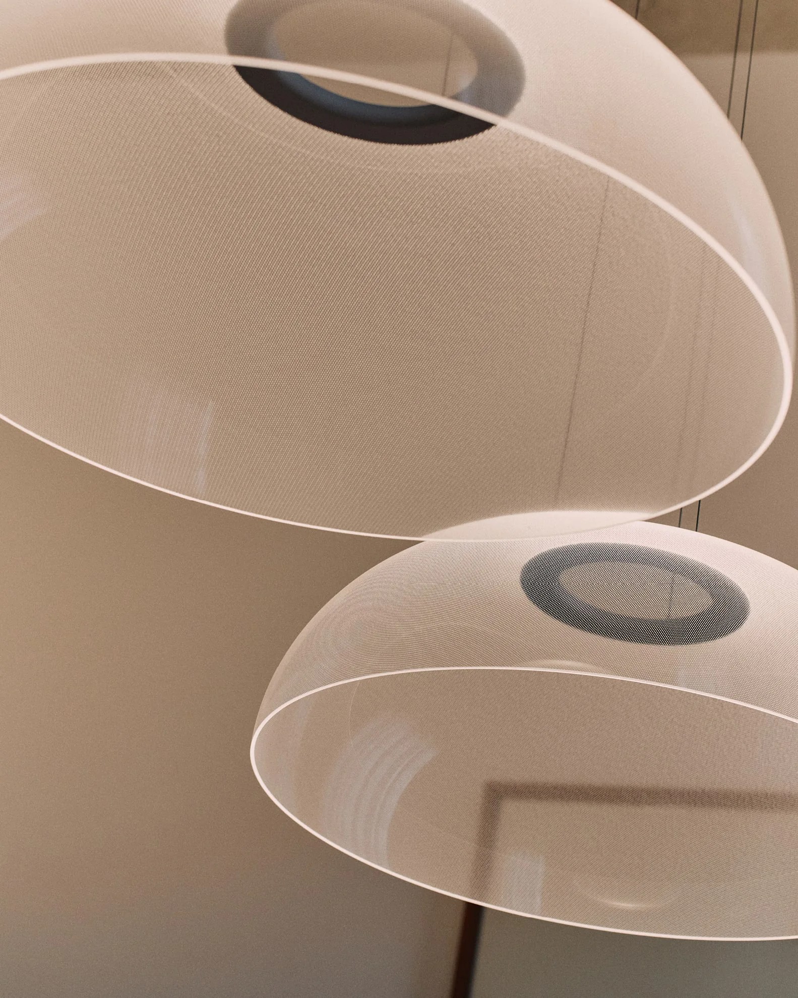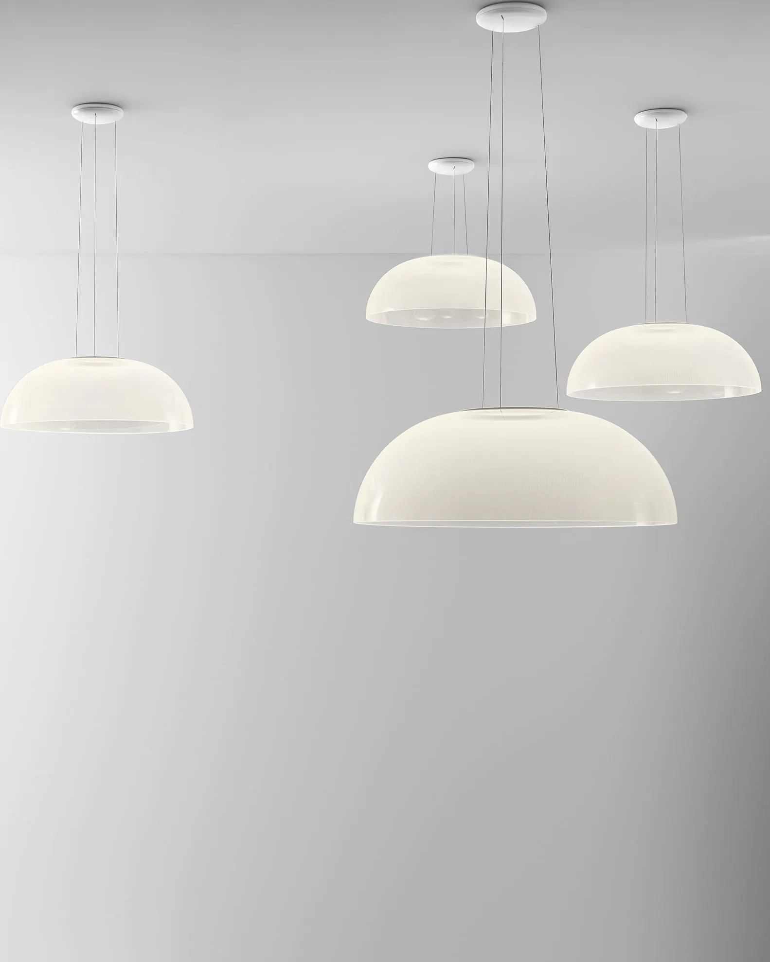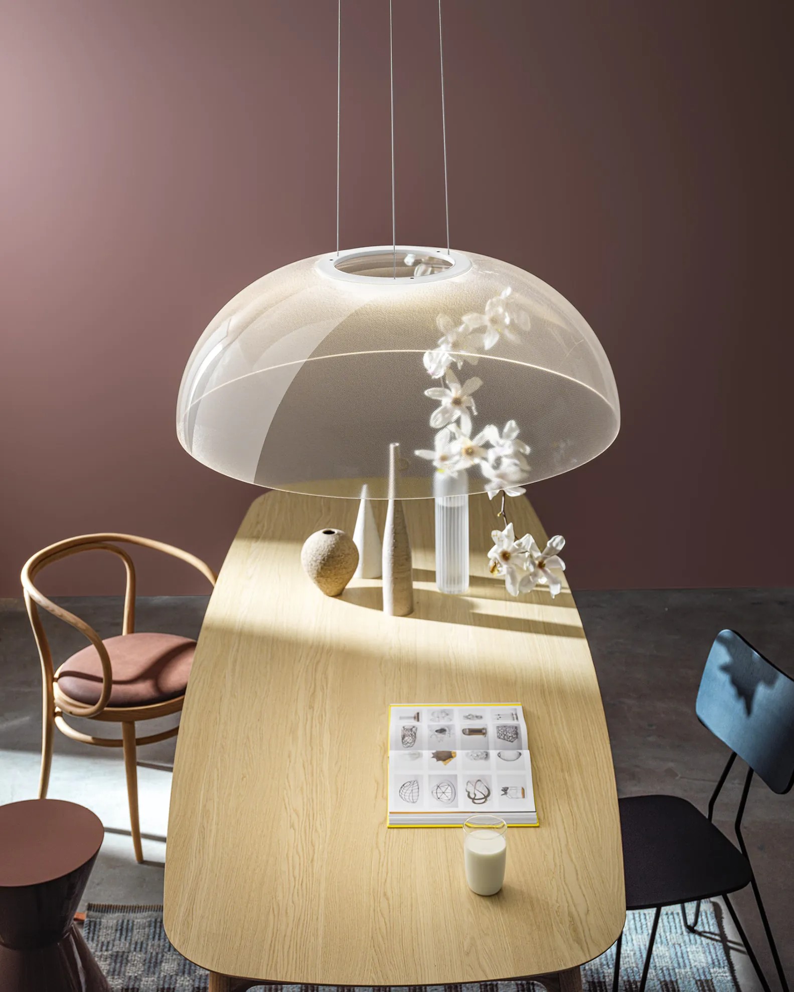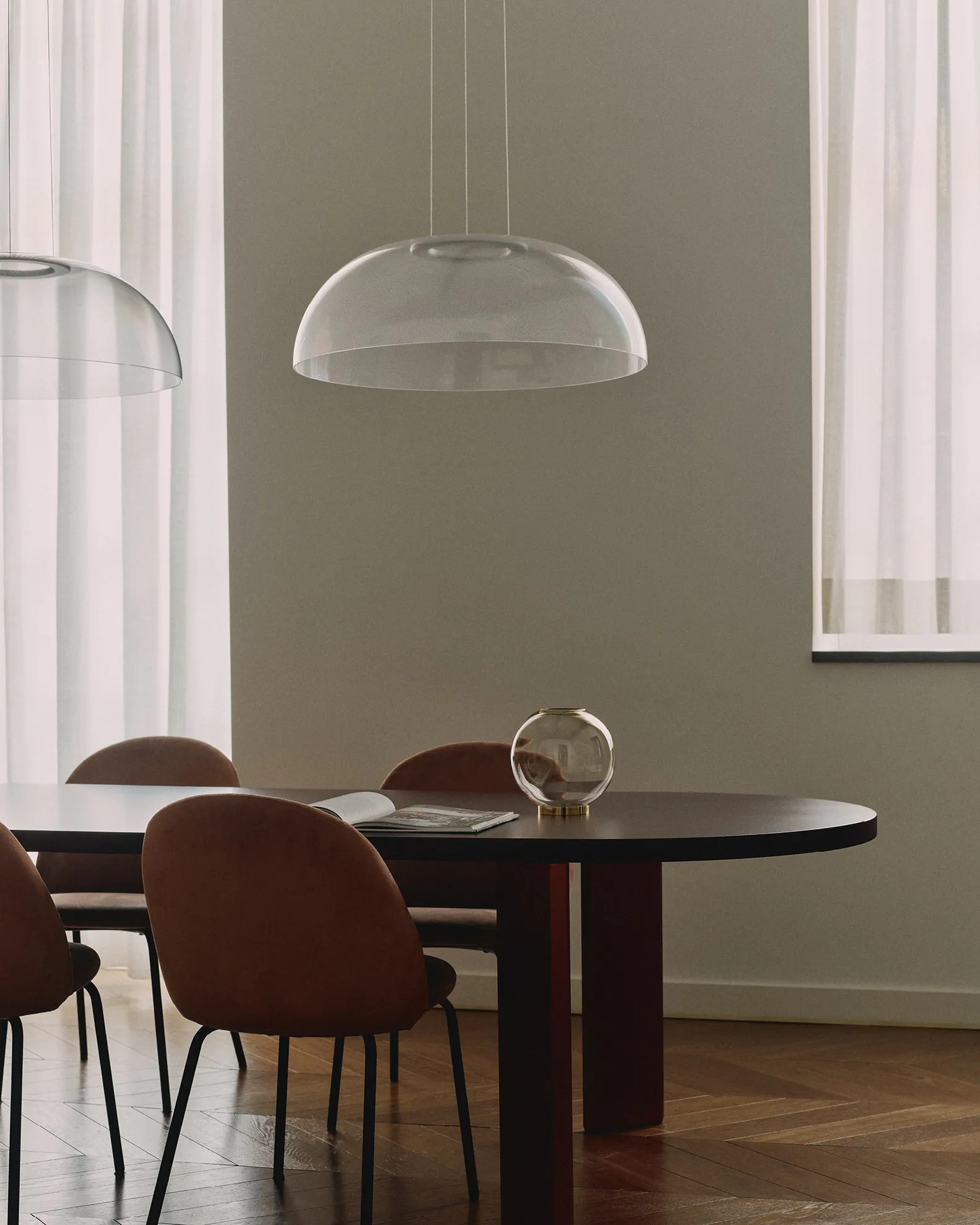 Светильник Demì Suspension держится на тонких тросах, которые одновременно проводят электричество. Поэтому никаких лишних проводов не видно — дизайн остаётся чистым и лаконичным.