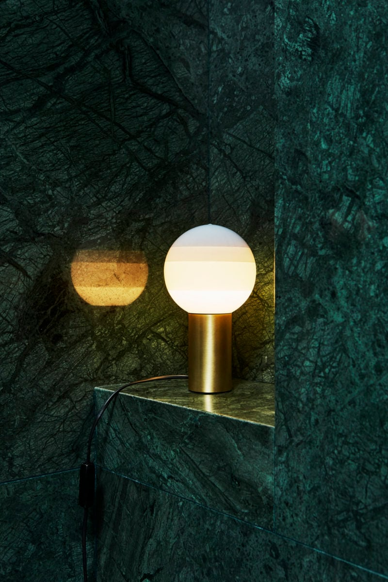 Слои пигмента формируют на поверхности лампы концентрические круги. Они играют роль естественного абажура, мягко рассеивая свет. Эта особенность не только придаёт светильнику неповторимый облик, но и создаёт особую визуальную глубину. Основание из матовой латуни или графита добавляет лампе элегантности. Каждый экземпляр становится единственным в своём роде.