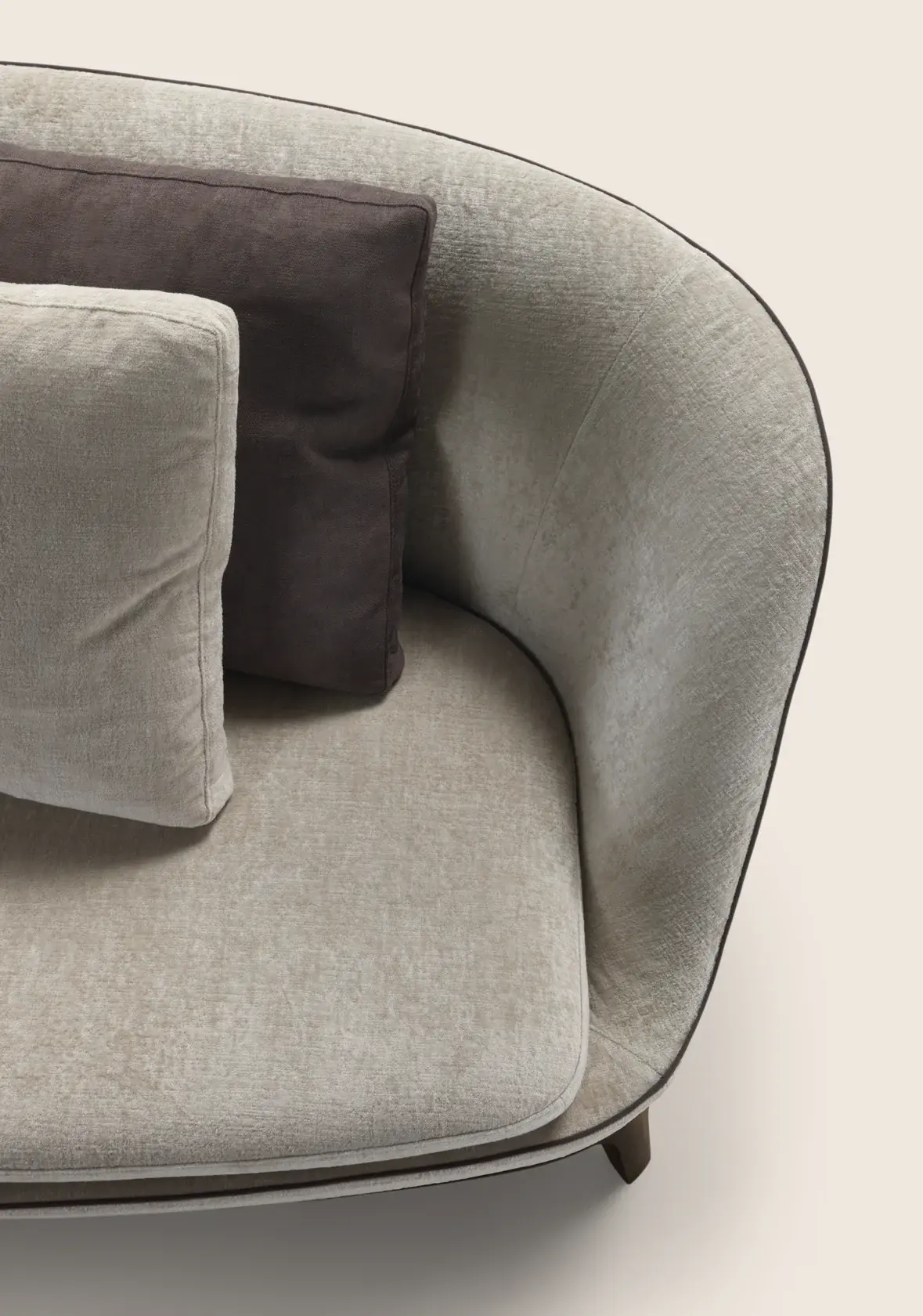 Особого внимания заслуживает окантовка из репсовой ленты, украшающая обивку дивана. Она подчёркивает лёгкость объёмов и изящные очертания модели, а также демонстрирует мастерство ручной работы, с которым выполнено изделие.