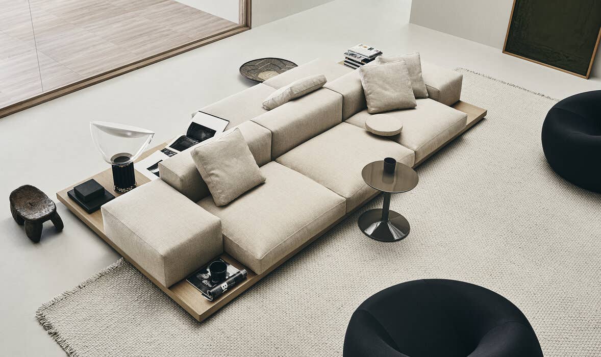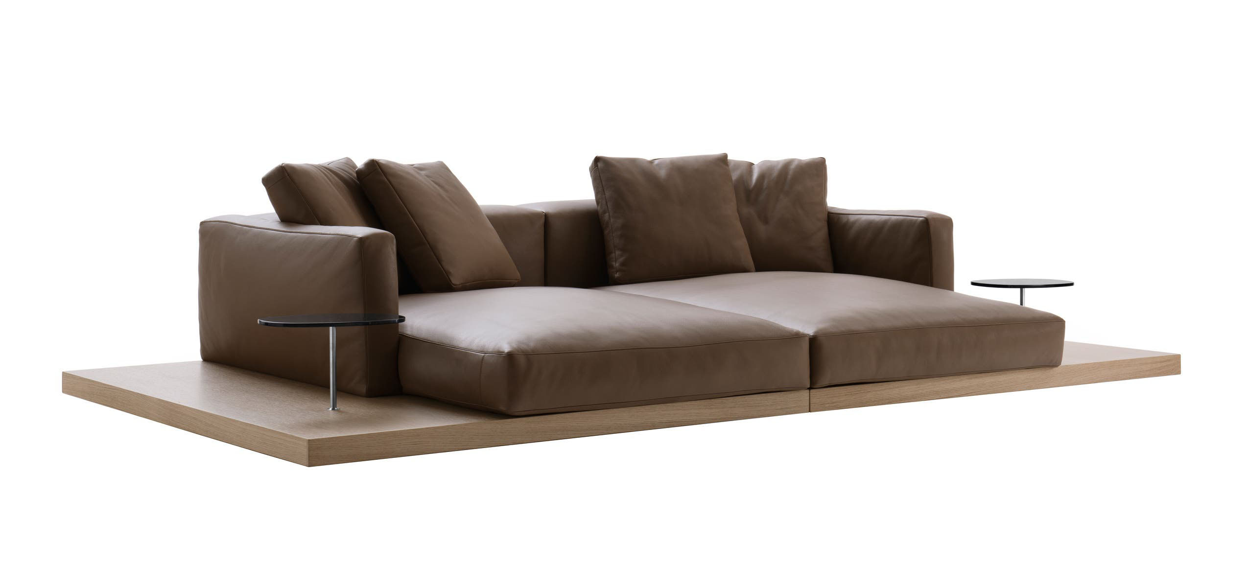 Одной из ключевых особенностей Dock является его горизонтально ориентированный проект, дополненный уникальной платформой с рельефной текстурой. Эта платформа выходит за пределы дивана, создавая дополнительную опорную поверхность и добавляя композиции выразительности. Она не только выполняет функциональную роль, но и служит декоративным элементом, подчеркивающим эстетическую привлекательность дивана.