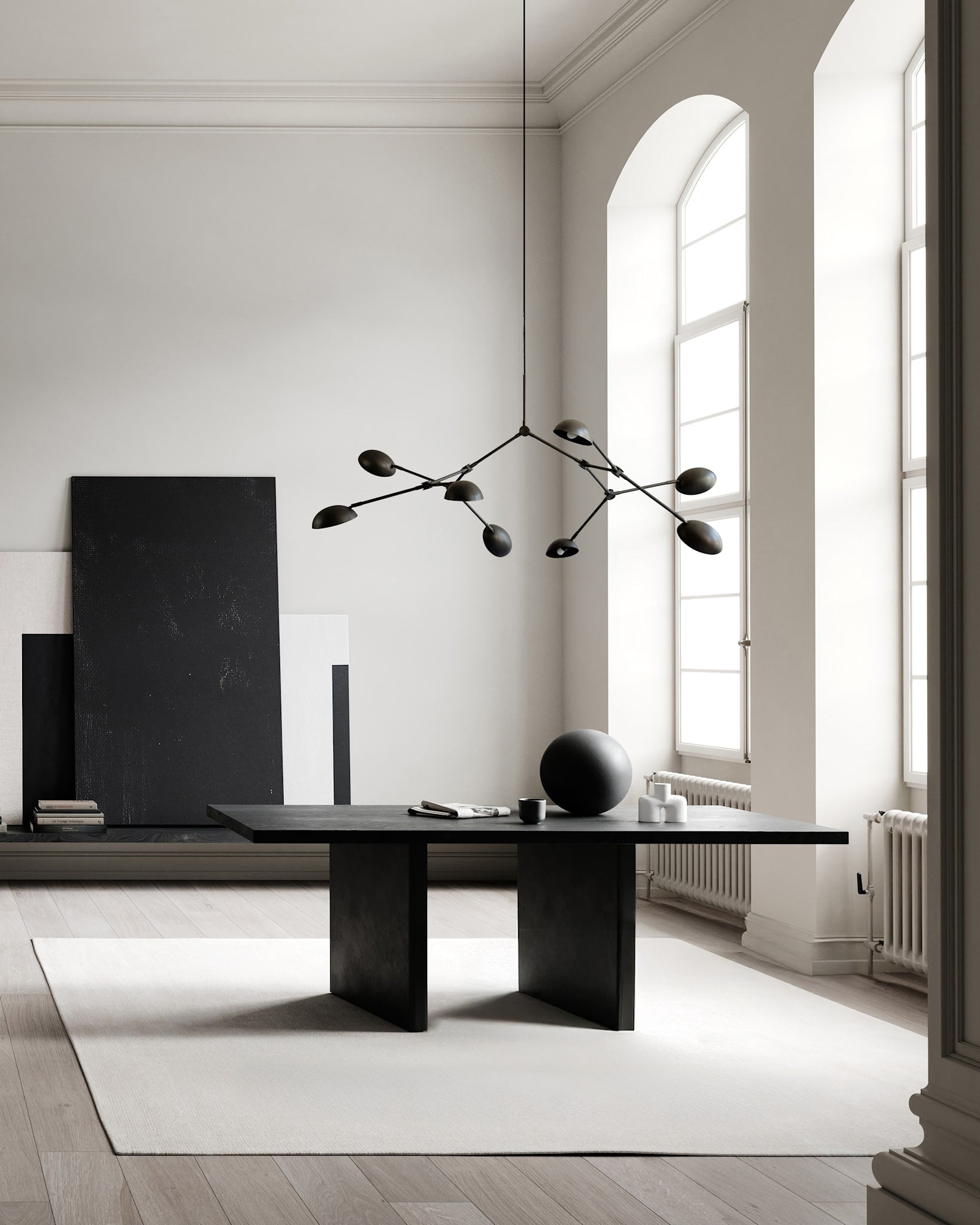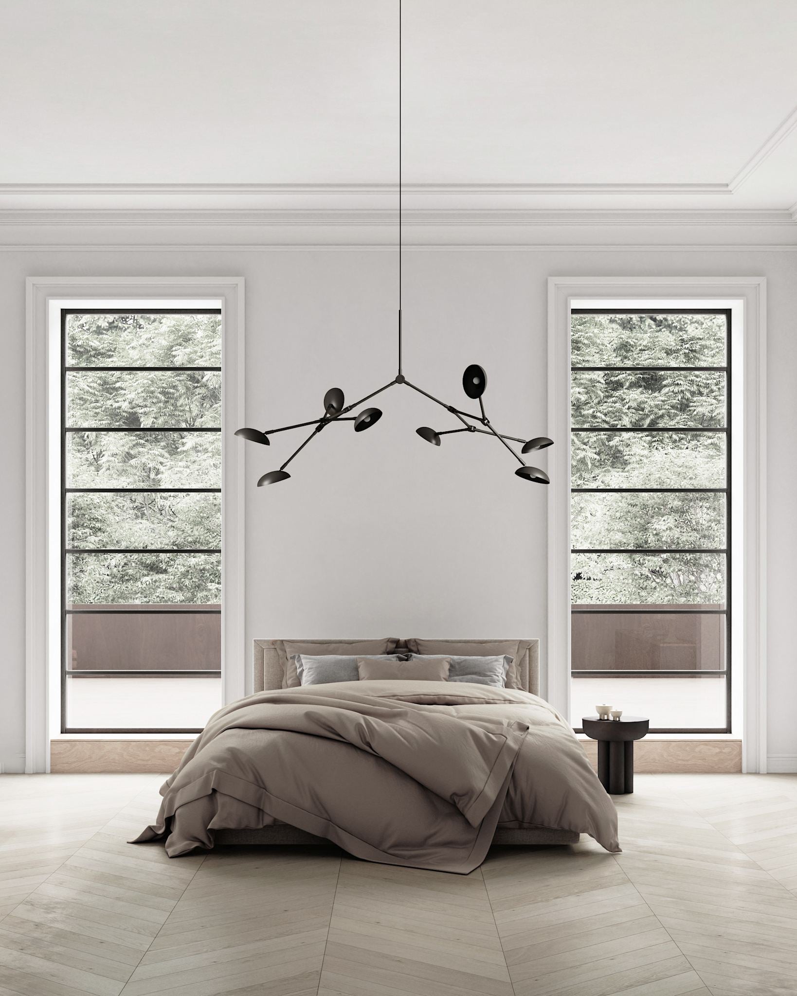 Вдохновленная модернистскими традициями середины XX века, эта люстра гармонично соединяет в себе классическую элегантность и современную смелость. Четырнадцать гибких кронштейнов, подобно ветвям, позволяют создавать бесчисленные вариации форм, меняя характер и настроение композиции. Плавные изгибы плафонов не просто направляют свет — они оживляют его, заставляя играть на поверхностях, создавая постоянно меняющиеся световые узоры.