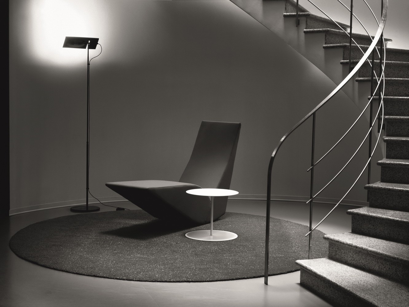 Торшер Duna изготовлен из стали с галогеновым источником света. Светильник может быть хромированным или окрашенным в глянцевый черный или белый цвет. Торшер имеет диммер, расположенный на кабеле. Основание светильника можно регулировать по длине.