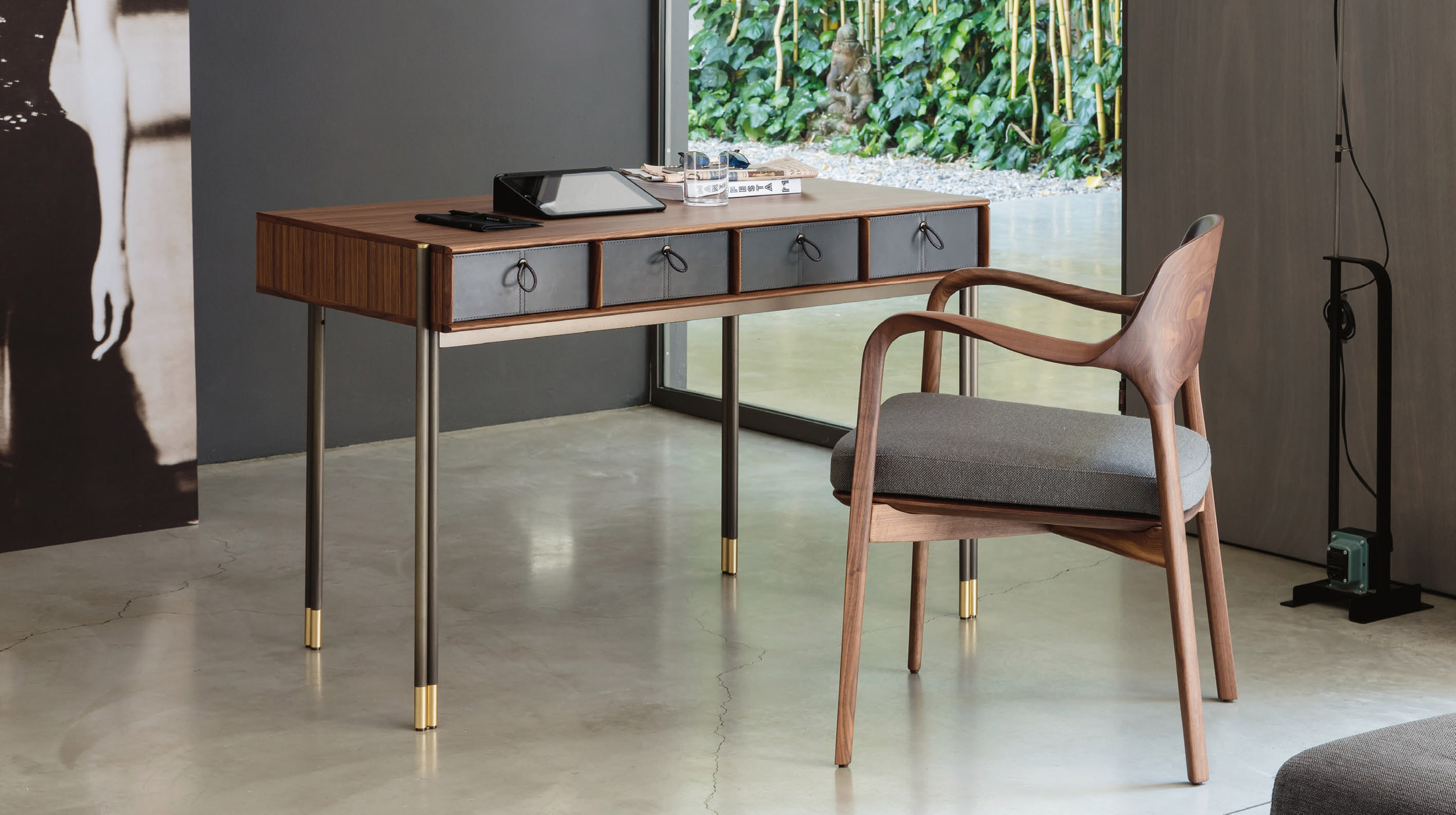 Стол выполнен из массива ореха Canaletta, что придаёт ему особую прочность и долговечность. В коллекции доступны два варианта тонировки: насыщенный цвет Moka, который создаёт атмосферу уюта и тепла, и глубокий оттенок Wengé, добавляющий нотку экзотики и роскоши. Металлический каркас Bronzoro не только обеспечивает надёжность конструкции, но и придаёт столу современный и стильный вид.
