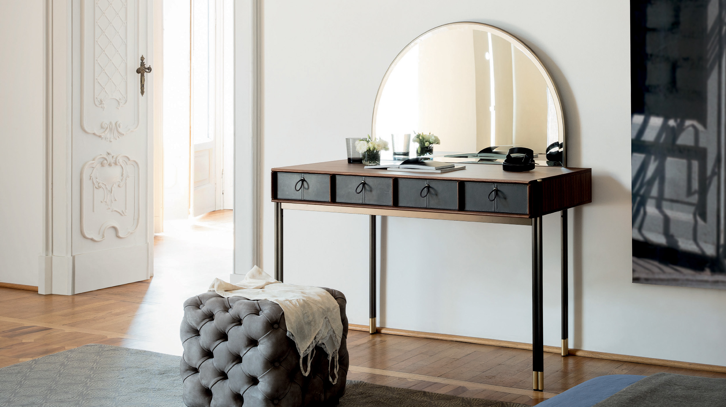 Задняя панель из ореха каналетто добавляет изделию тепла и естественности. Дерево, известное своей прочностью и красотой, гармонично сочетается с металлическим обрамлением, создавая баланс между современными и классическими элементами. Ореховая текстура придаёт зеркалу глубину и насыщенность, что делает его не просто функциональным предметом, но и выразительным акцентом.