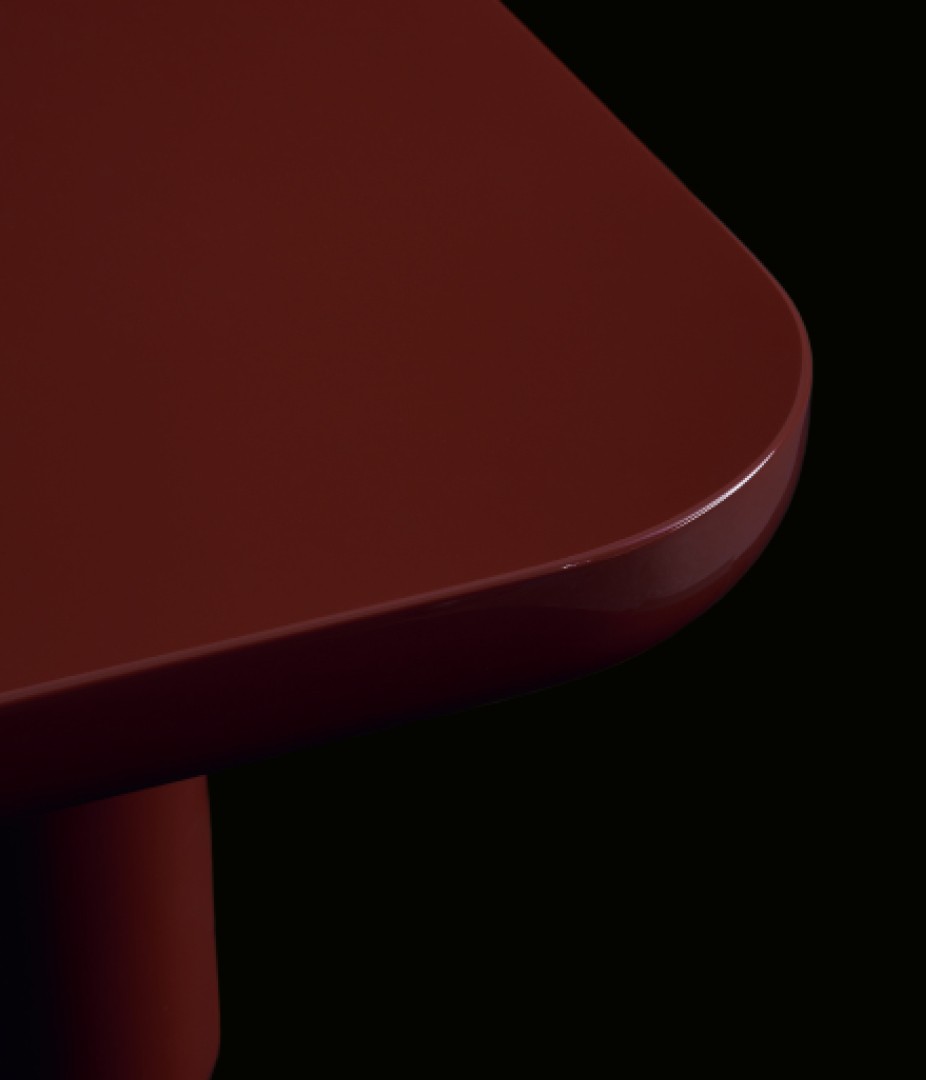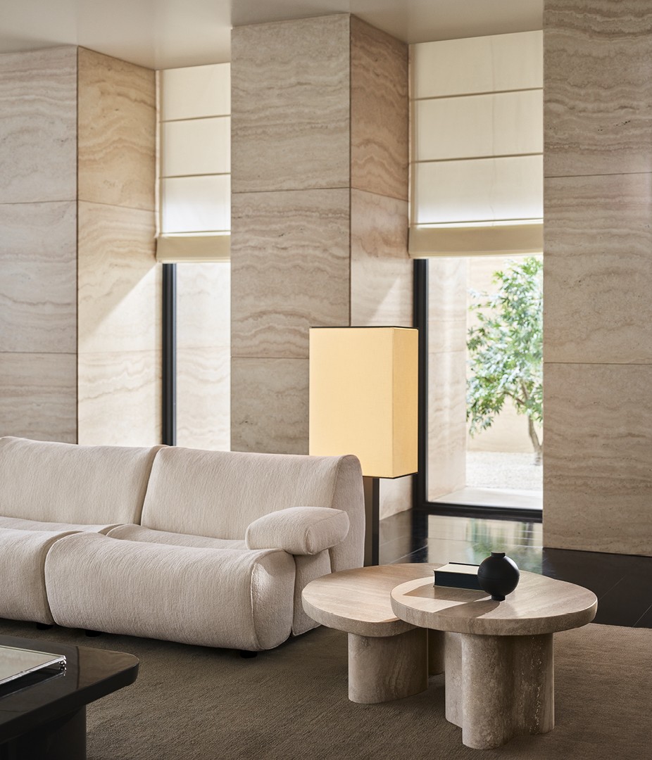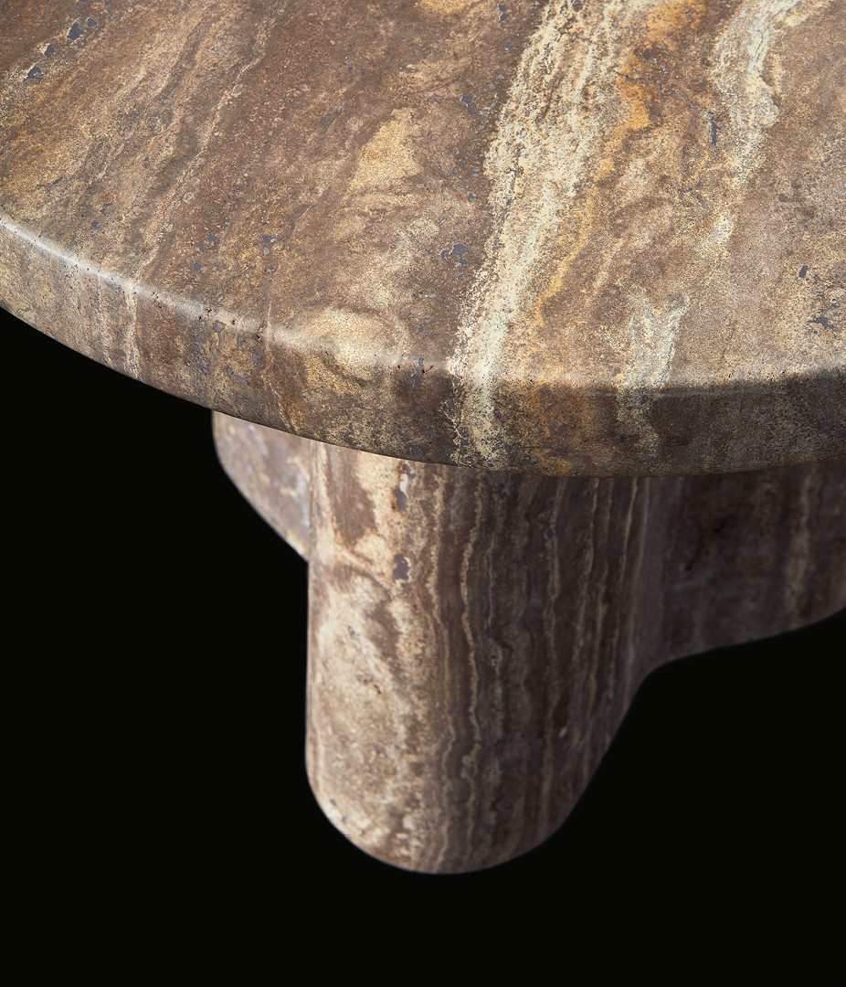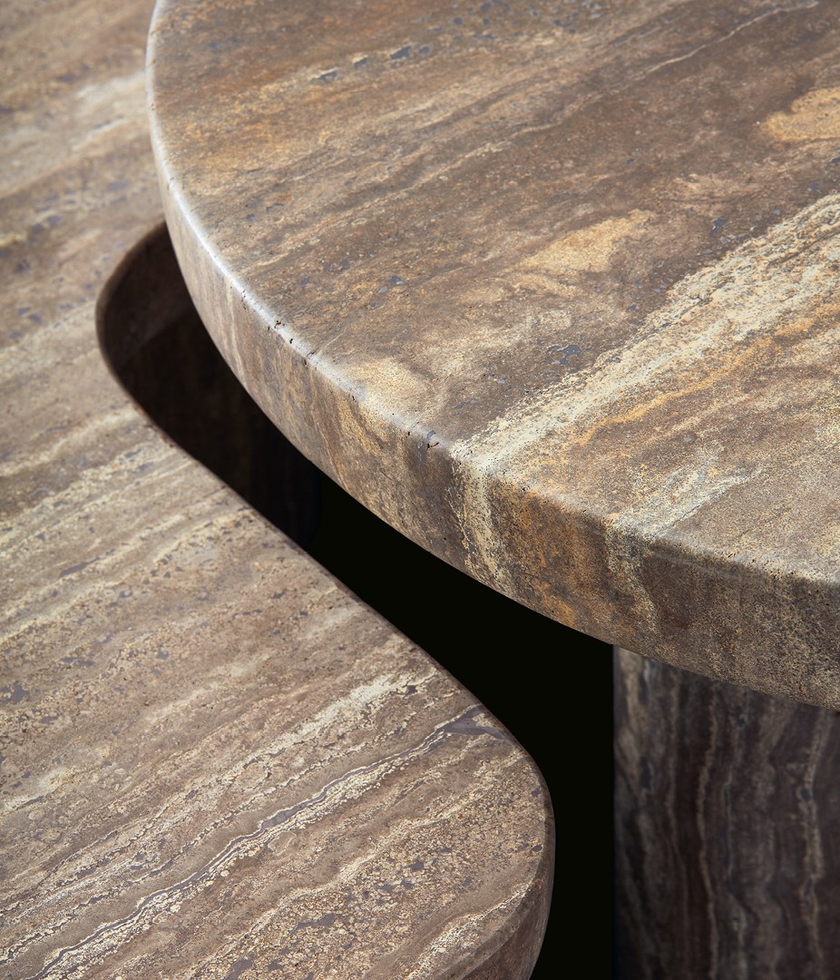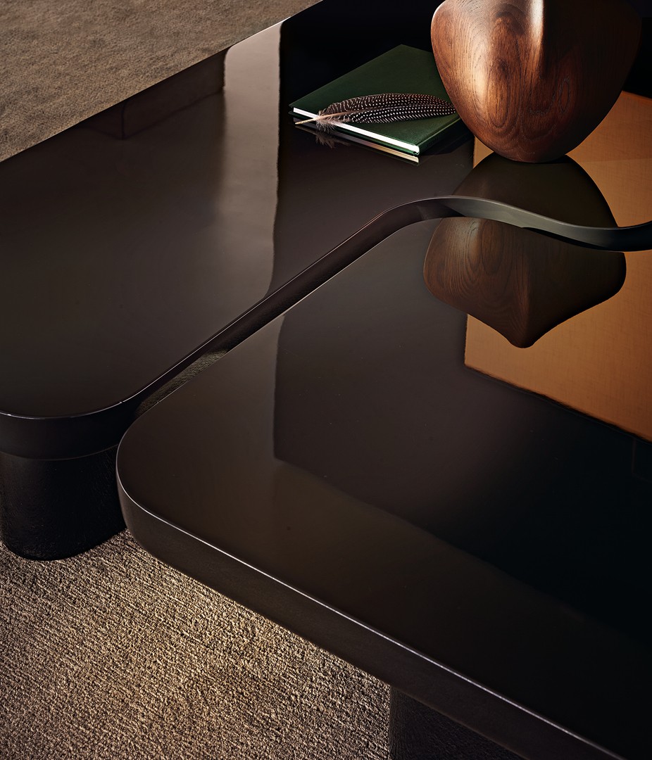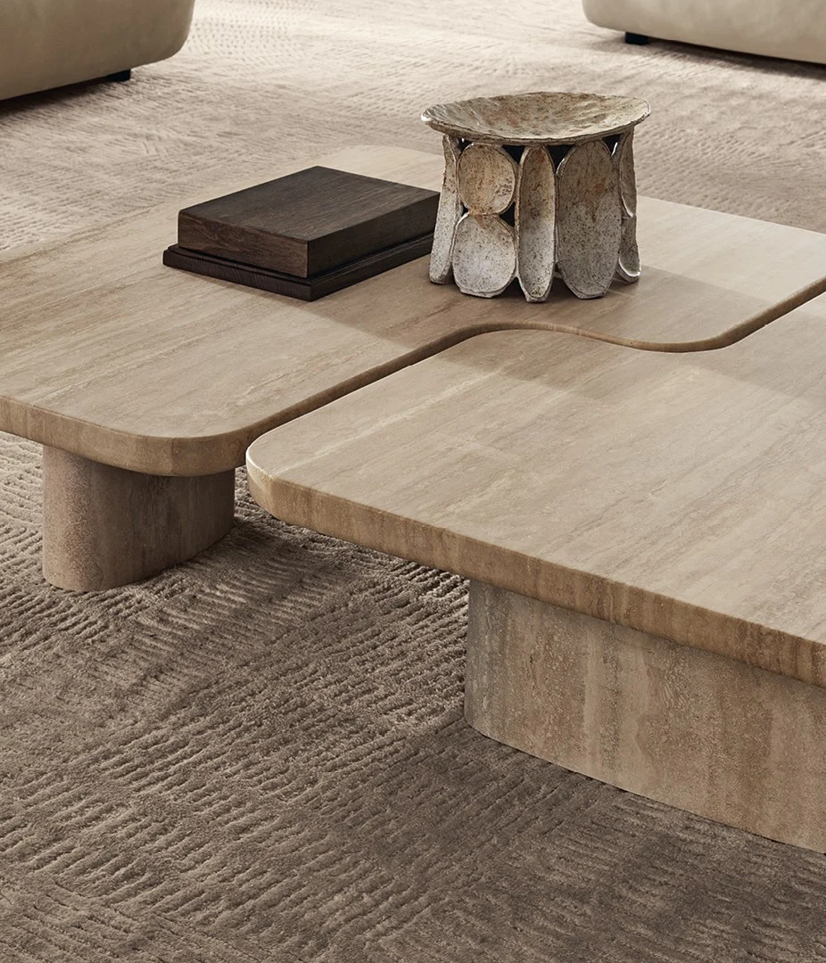Конструкция столиков воплощает диалог материалов — плотная глубина лакированного МДФ, теплая органичность массива дерева и сдержанная роскошь травертина перекликаются в их каркасе, создавая сложную текстуру поверхности. Столешница продолжает этот визуальный рассказ, предлагая игру контрастов: от гладкой лаковой полировки до природной выразительности шпона и натурального камня. Такой подход превращает даже отдельный предмет в многослойное произведение мебельного искусства, где тактильные ощущения и игра света становятся частью дизайна.