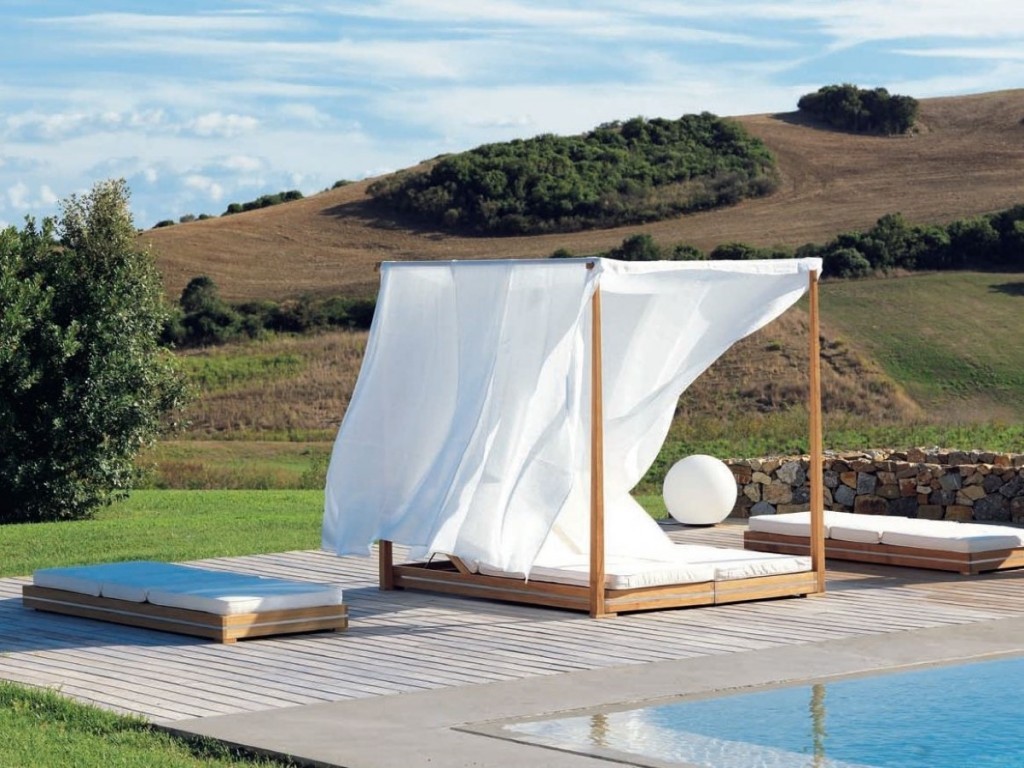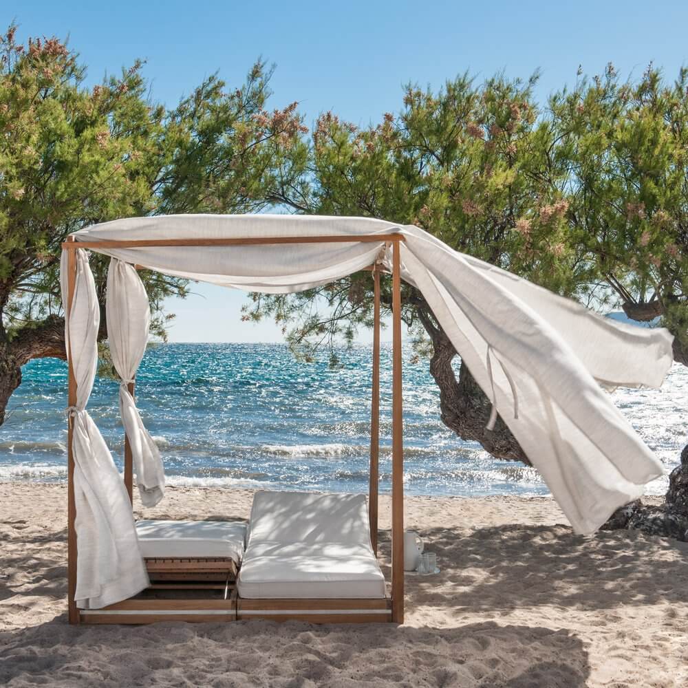 Essenza — удобный шезлонг из тика со шторками и матрасом, состоящий из двух лежаков. Модель регулируется в четырех положениях. В стоимость включены навес и шторки. Дополнительно можно приобрести мягкий матрас из акрила в двух цветах (слоновая кость и антрацит) и чехол от дождя. В коллекцию Essenza входят стол, стул, двухместный и одноместный шезлонги. Более подробную информацию можно уточнить у менеджера.