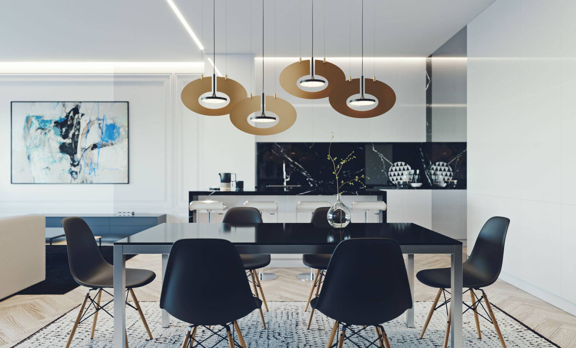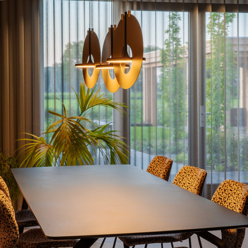 Изящные овальные диски выполнены из высококачественного анодированного алюминия. Они придают изделию чувство уверенности и стабильности. Покрытие дисков выполнено в тёплых оттенках золота или серебристых металлических тонах. Это подчёркивает уникальность каждой детали и отражает игру света. Игра света наполняет пространство особым настроением. Центральная подвеска выполненная в чёрном цвете, добавляет динамику и подчёркивает общую композицию. Подвеска обеспечивает зрительное равновесие и визуально скрывается среди теней. Она подобно точке притяжения направляет взгляд вверх.