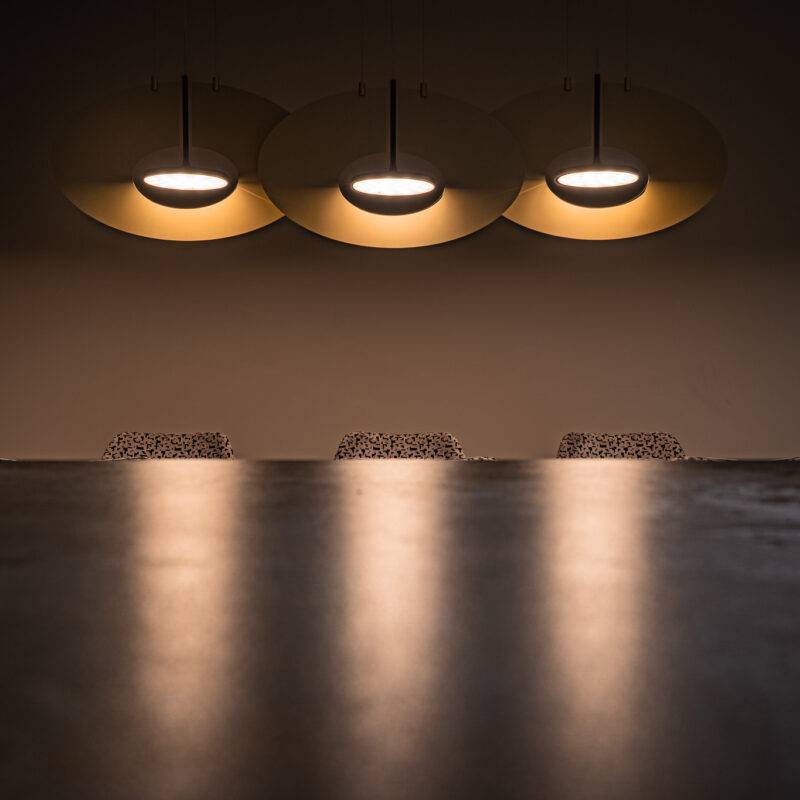 Особый интерес представляет оригинальная конструкция матового стекла. Его поверхность слегка мерцает мягким светом по краям. Это создаёт уникальный оптический эффект. Эта деталь придаёт светильнику дополнительную привлекательность. Она усиливает ощущение объёма, позволяя создать атмосферу интимности и спокойствия. Важным преимуществом является отсутствие теней на поверхности стола. Благодаря этому объект воспринимается практически невесомым, лёгким и будто бы зависшим в воздухе.
