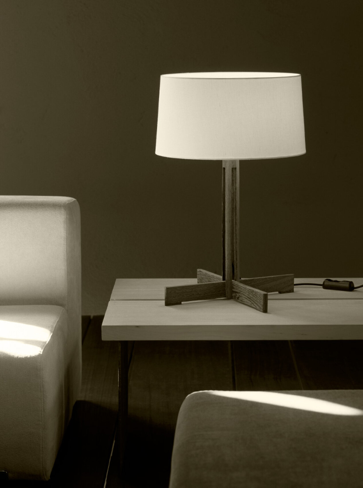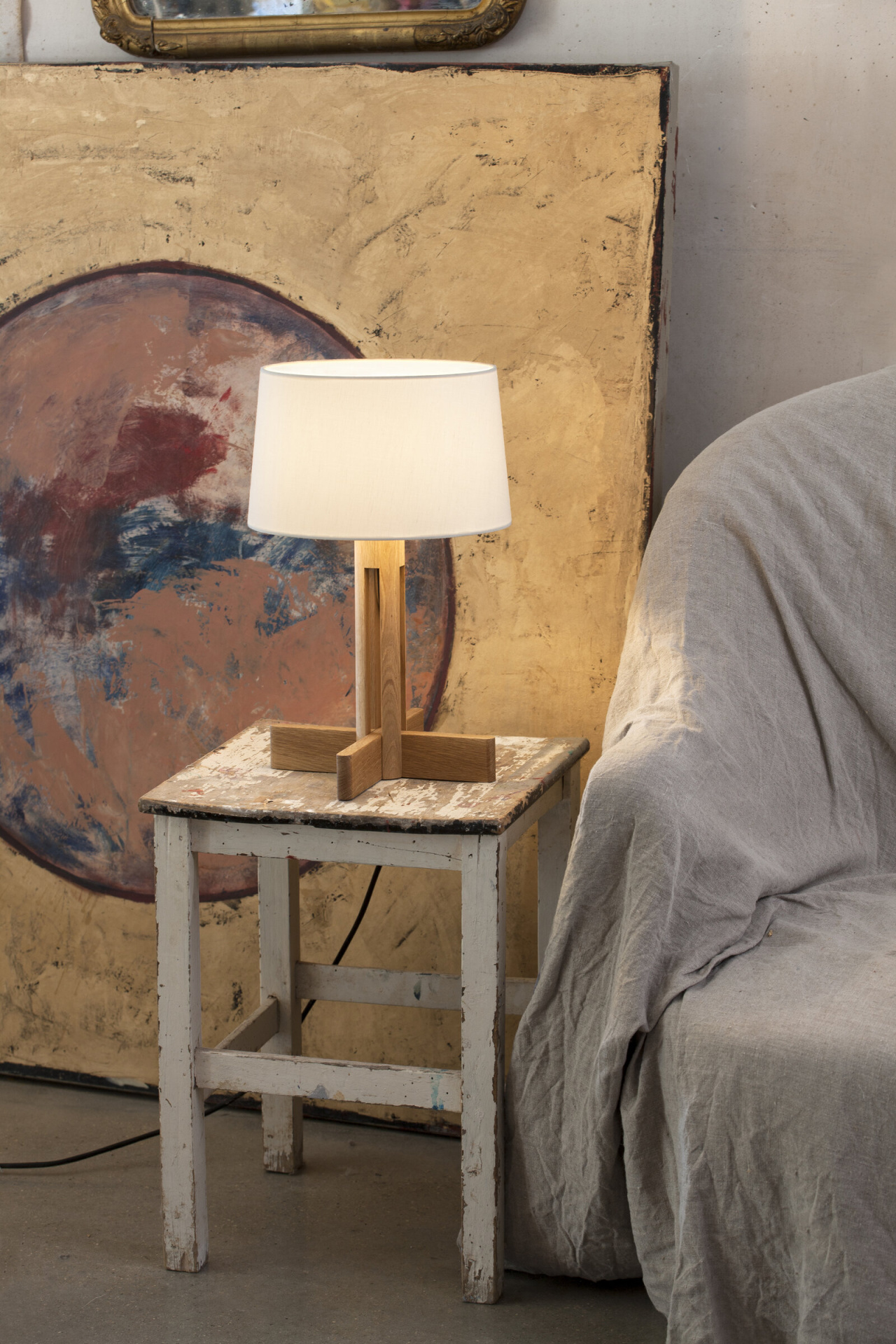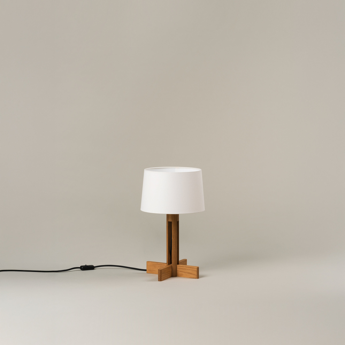 Особенностью светильника является его крестообразное пересечение ножек, которое перекликается с другими классическими работами Мигеля Мила. Этот элемент имеет тот же размер, что и нижняя окружность абажура, выполненного из белого льна. Такое сочетание материалов и форм создаёт гармоничное и сбалансированное визуальное впечатление.