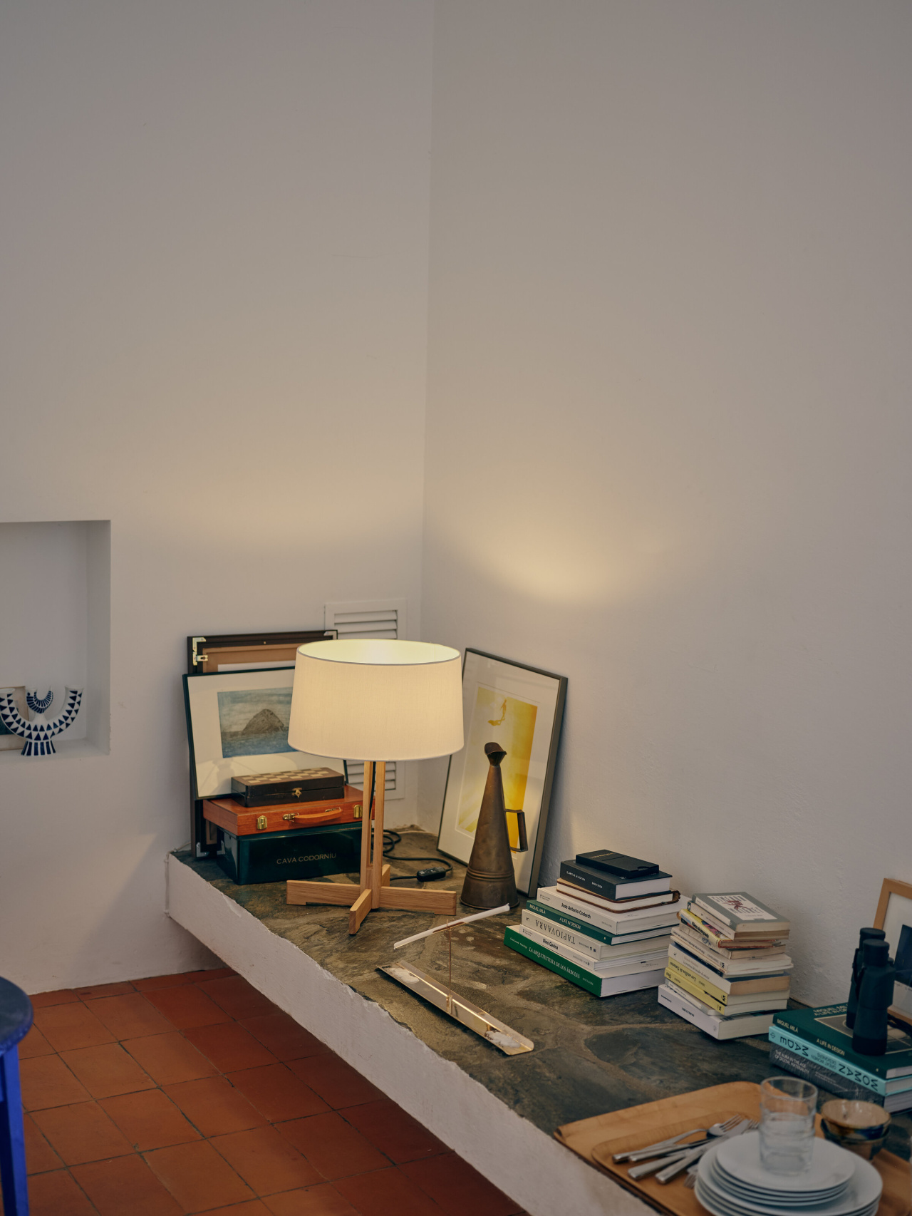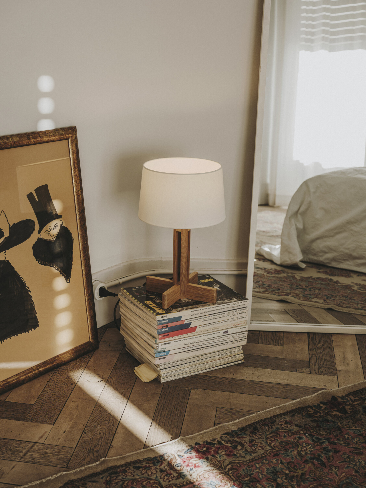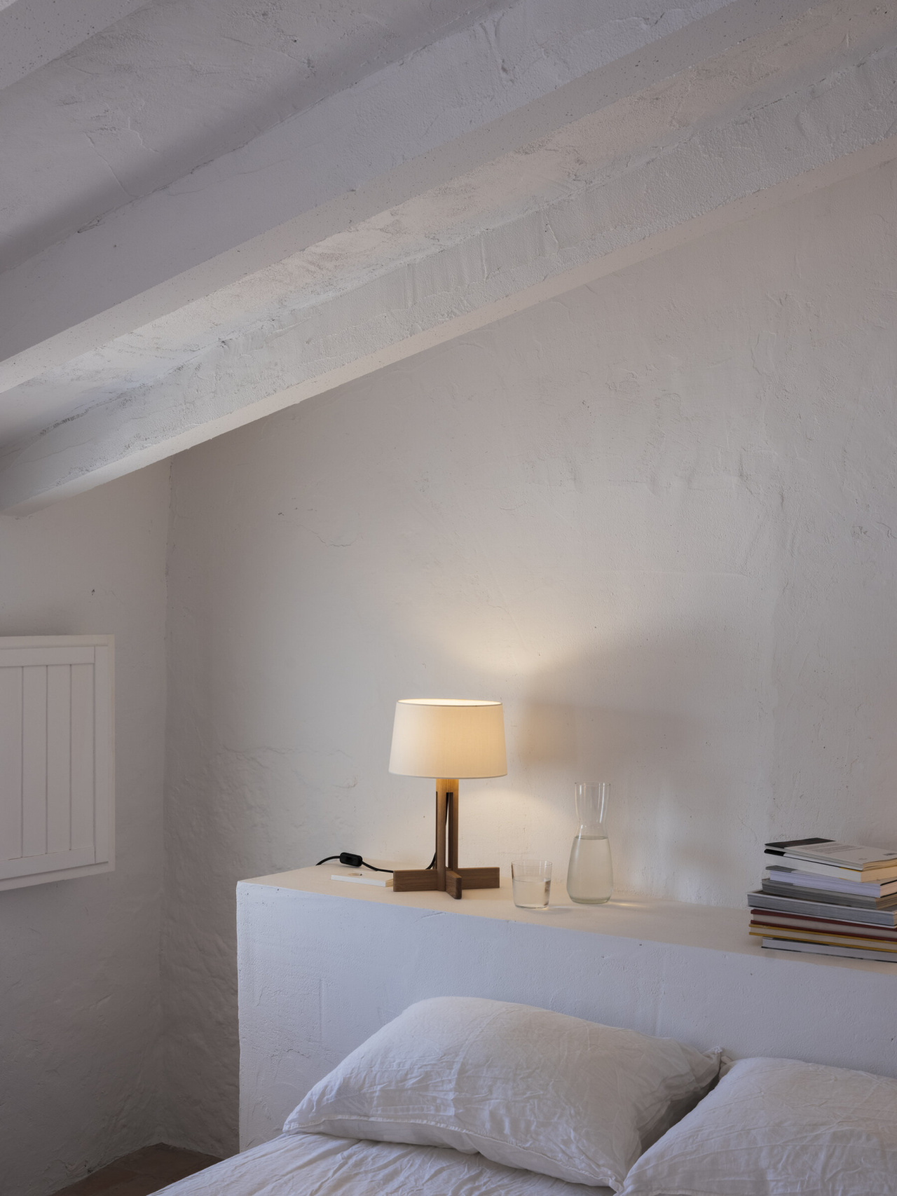 Особенностью светильника является его крестообразное пересечение ножек, которое перекликается с другими классическими работами Мигеля Мила. Этот элемент имеет тот же размер, что и нижняя окружность абажура, выполненного из белого льна. Такое сочетание материалов и форм создаёт гармоничное и сбалансированное визуальное впечатление.