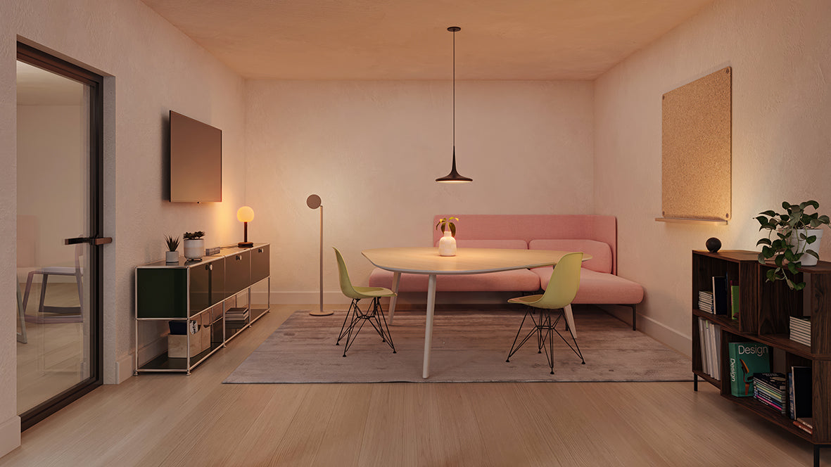 Одна из главных особенностей — технология Warm Dim: при снижении яркости свет становится теплее, имитируя естественное угасание дневного света.