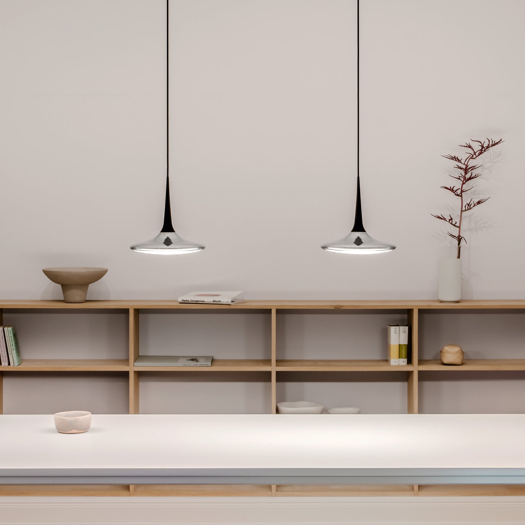Подвесной светильник Falling Leaf Trace сочетает элегантный дизайн и современные технологии освещения. Его большая оптическая линза обеспечивает равномерное свечение без бликов, комфортно освещая всю поверхность стола.
