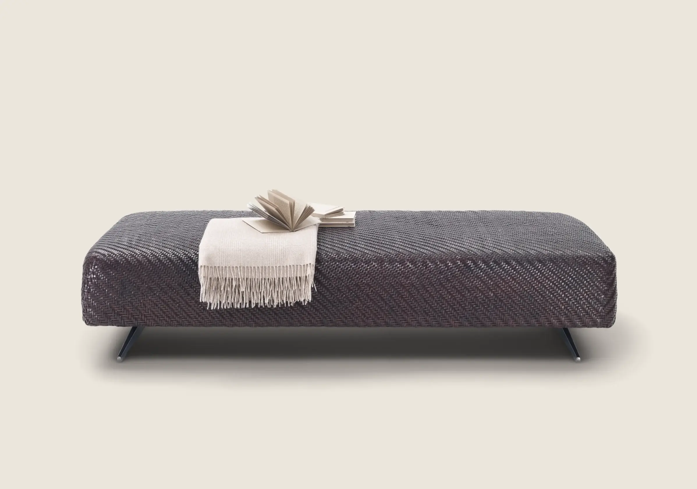 Металлические ножки с разнообразными вариантами отделки — от классического хрома до матового титана — придают пуфу современный и элегантный облик. Завершают образ практичные наконечники из термопластика, защищающие пол от царапин и придающие конструкции дополнительную устойчивость.