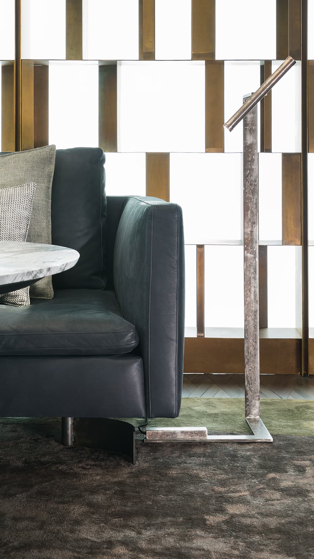 Латунный стержень в плоских формах играет важную роль в дизайне лампы. Он придаёт ей динамичность и современный вид. Стержень взаимодействует с геометрическими линиями и углами. Это создаёт выразительный визуальный эффект. Элемент выполняет декоративную функцию. Он также подчёркивает скульптурные качества лампы. Это делает её настоящим произведением искусства.