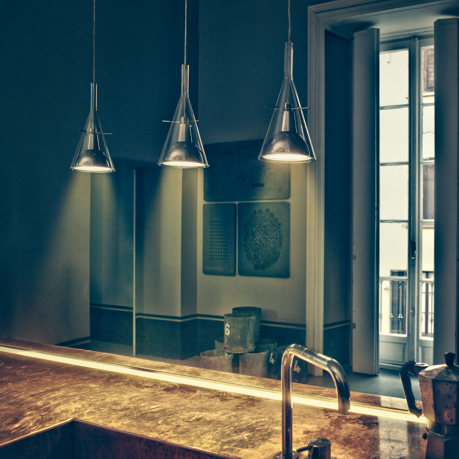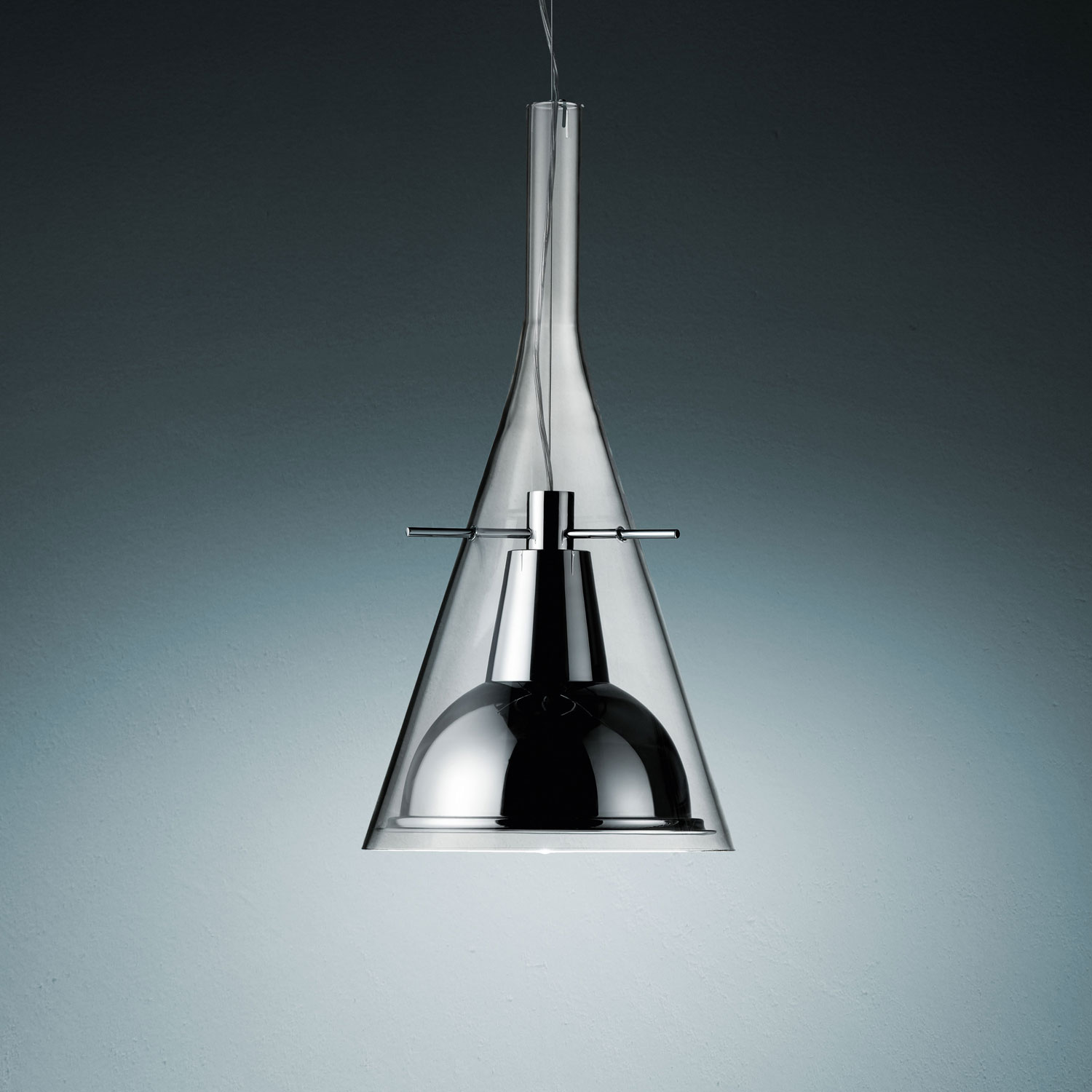 Коллекция Flute Fontana Arte, разработанный Franco Raggi, является одной из самых продаваемых бренда. Диффузор изготовлен из стекла. Прозрачная воронка создают впечатление легкости, в сочетании с акцентами хромового блеска на алюминиевом отражателе. База также хромированный металл. Существуют различные вариации: с одной, двумя или тремя лампами.