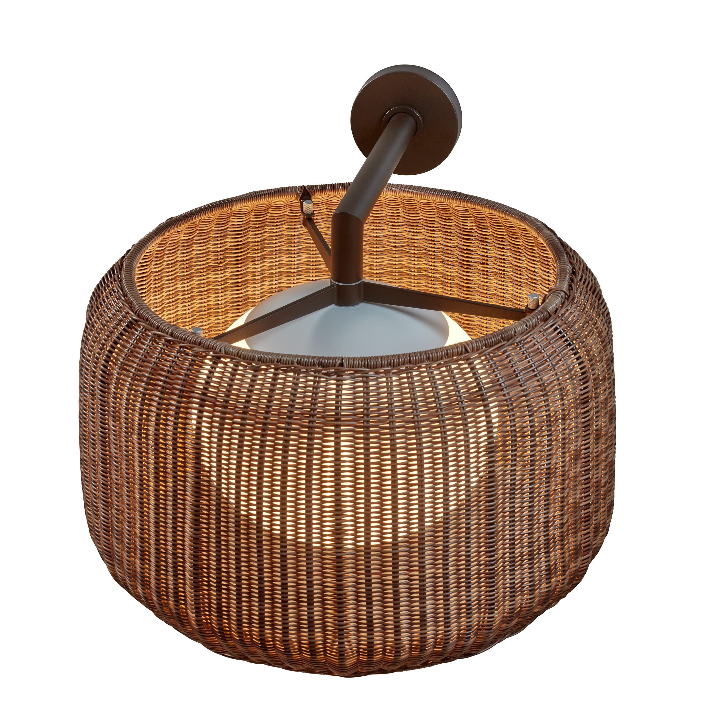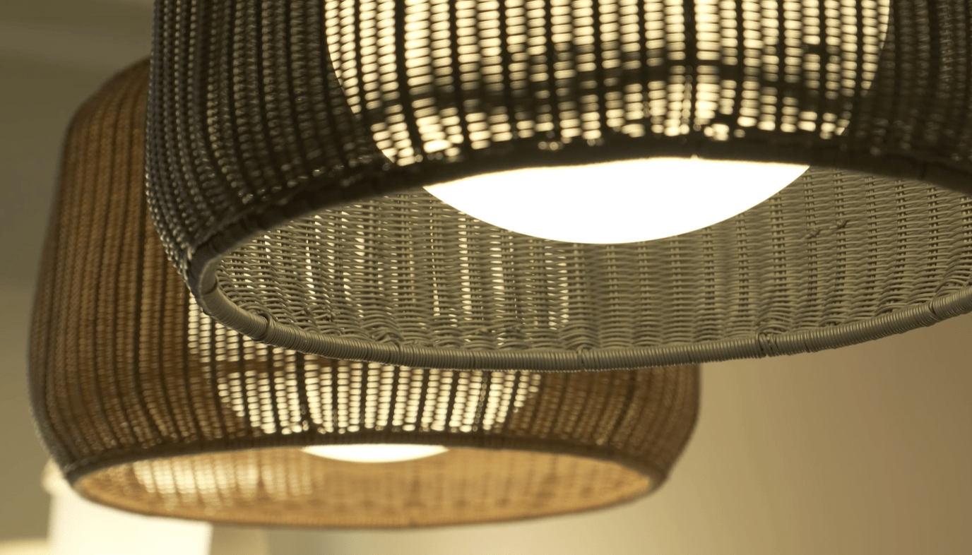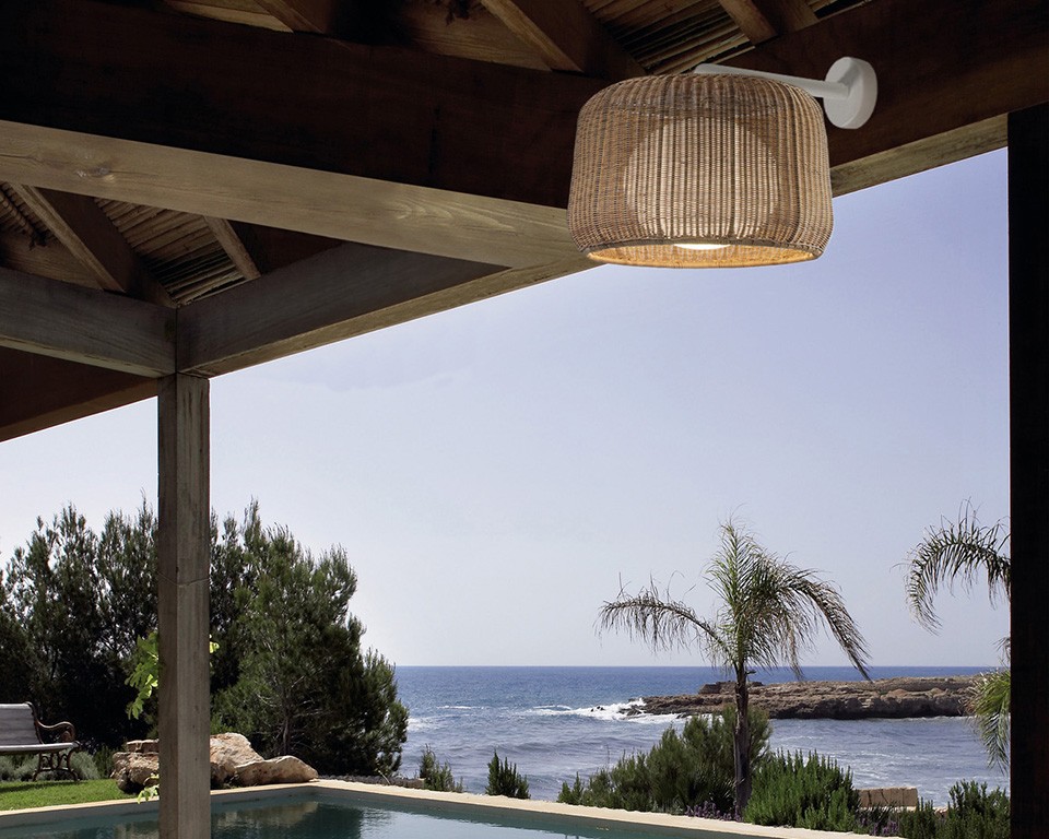 Мягкий рассеянный свет проходит через абажур из синтетической плетеной ткани, которая сохраняет свои качества даже под воздействием непогоды. Это решение придает освещению особенное теплое свечение, создавая комфортную и расслабляющую атмосферу.