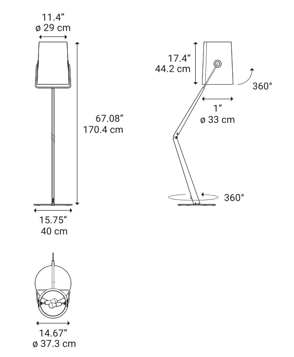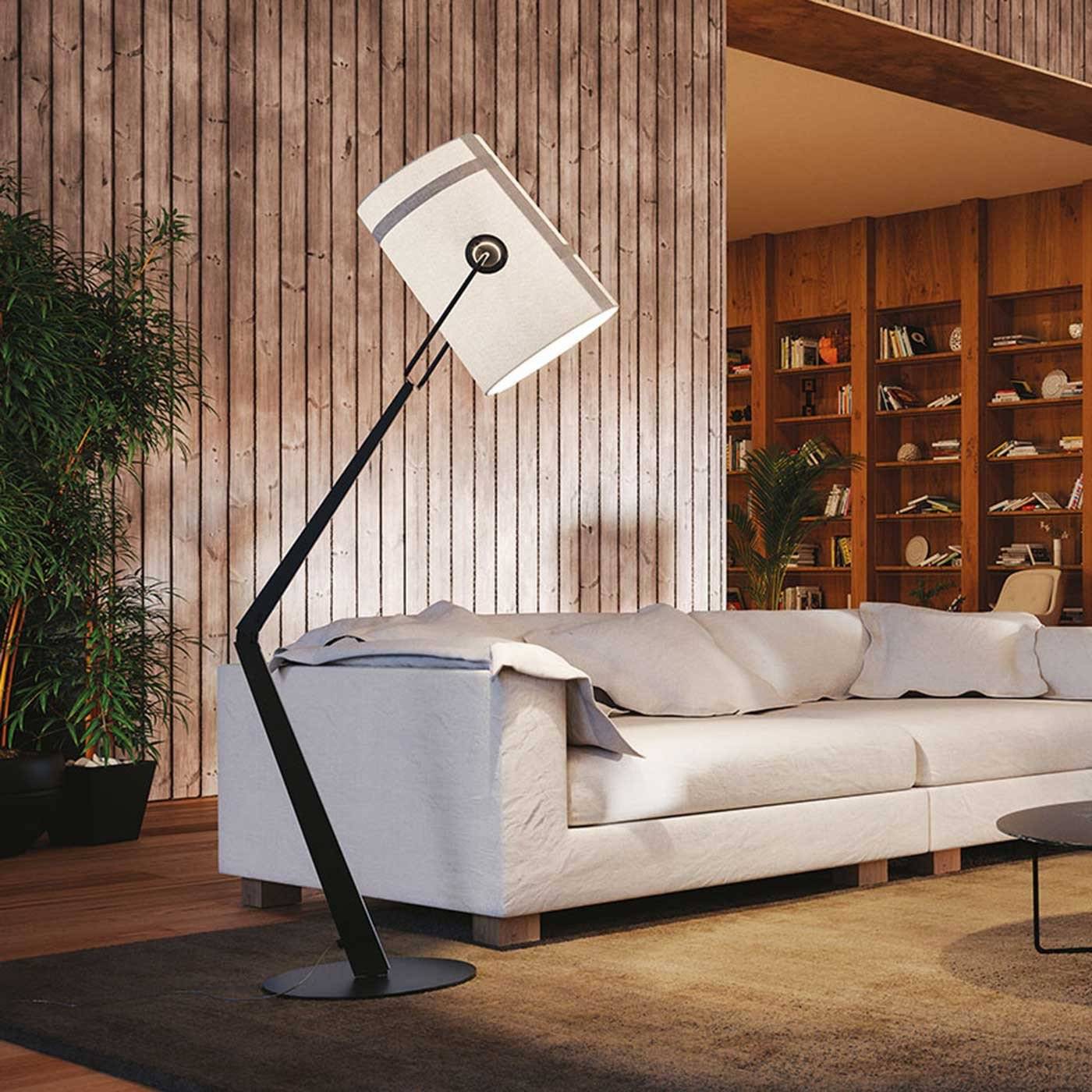 Металлическая структура, поддерживающая диффузор, доступна в двух цветовых вариантах: кремовом и антрацитовом. Стержень с характерным наклоном вращается на основании, что добавляет торшеру функциональности. Это позволяет легко менять направление света.