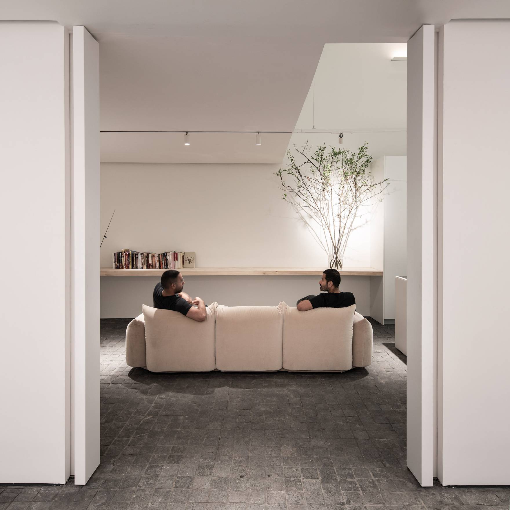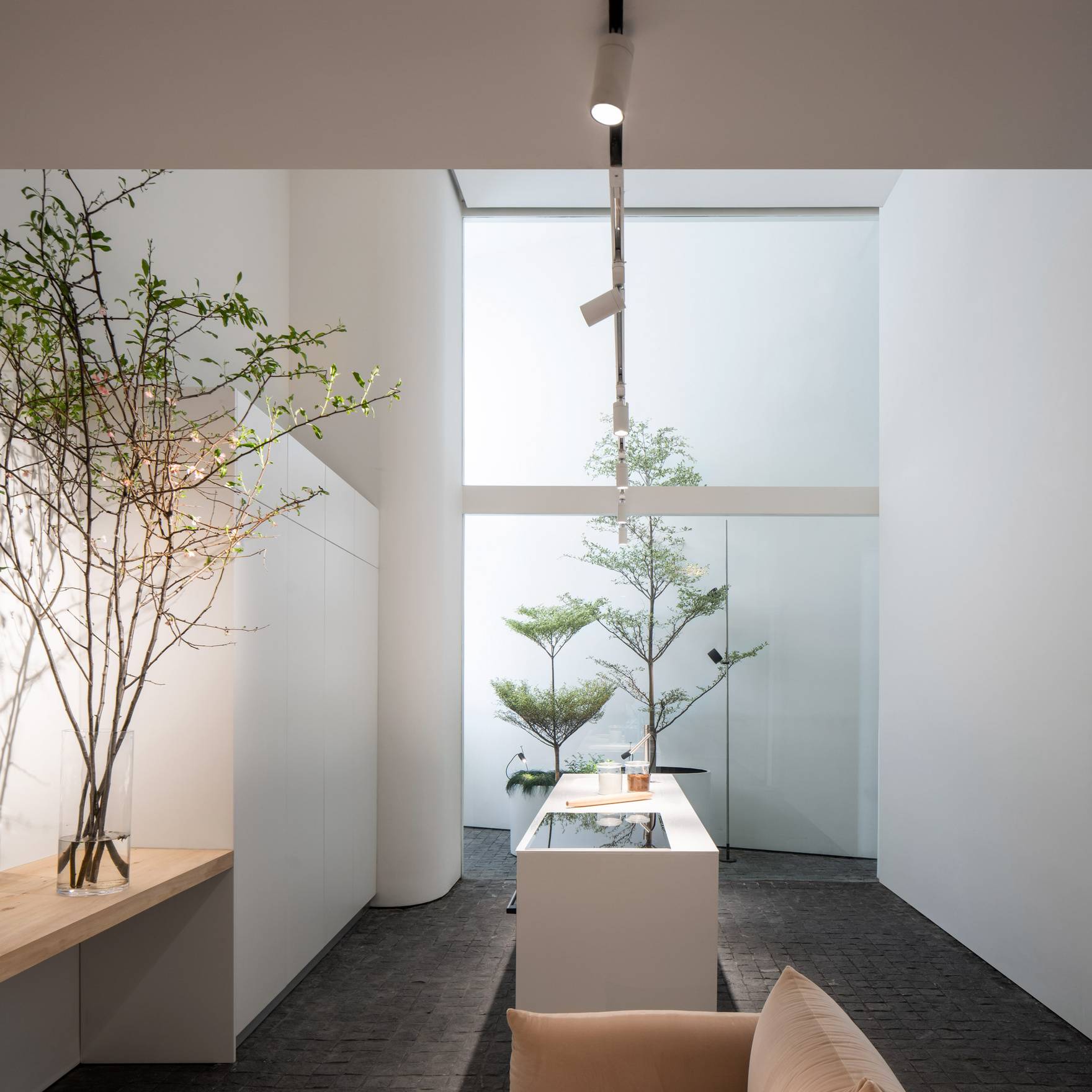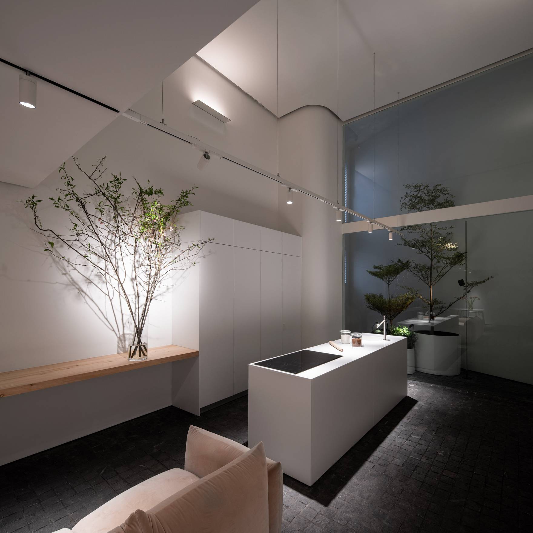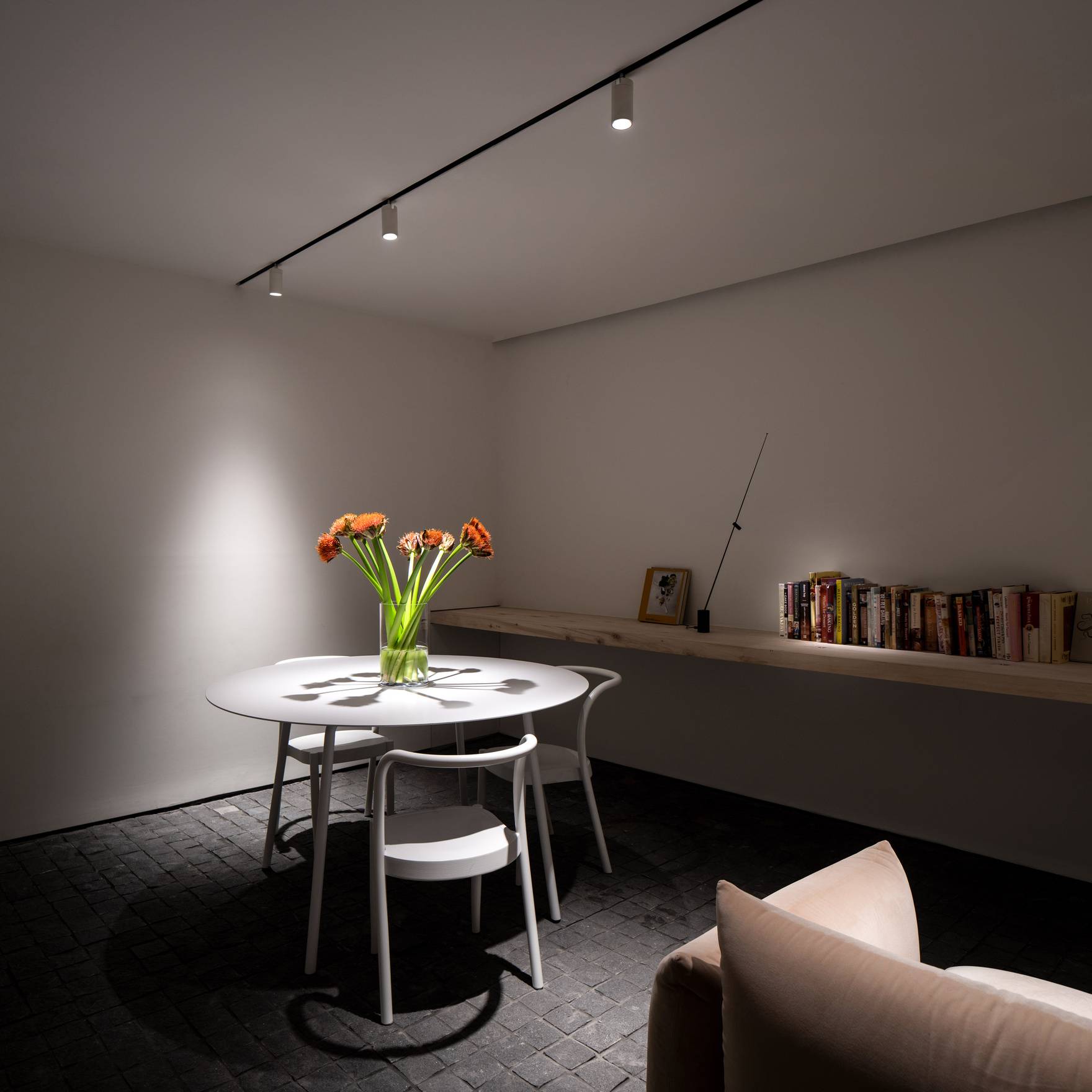 Перпендикулярно гипсокартонной направляющей размещается плафон цилиндрической формы. Его контрастный белый цвет с чёрной каймой в области источника света придаёт светильнику уникальный и стильный вид. Прозрачная закалённая стеклянная полоска, закрывающая плафон, добавляет утончённости и позволяет свету мягко рассеиваться, создавая уютную атмосферу.