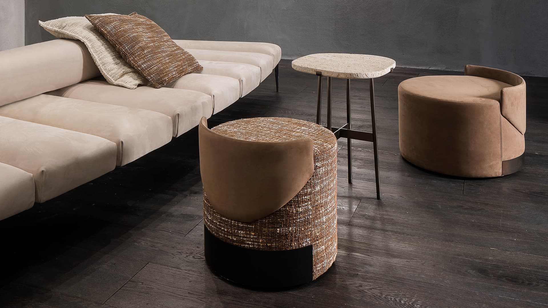 Изготовленные из фанеры, обшитой пенополиуретаном разной плотности, пуфы Gelly сочетают в себе элегантный дизайн и практичность. Разнообразие текстур и цветов пенополиуретана позволяет создавать изделия с уникальными свойствами: одни пуфы могут быть мягкими и уютными, другие — более плотными и структурированными, что делает их подходящими для различных ситуаций и предпочтений.
