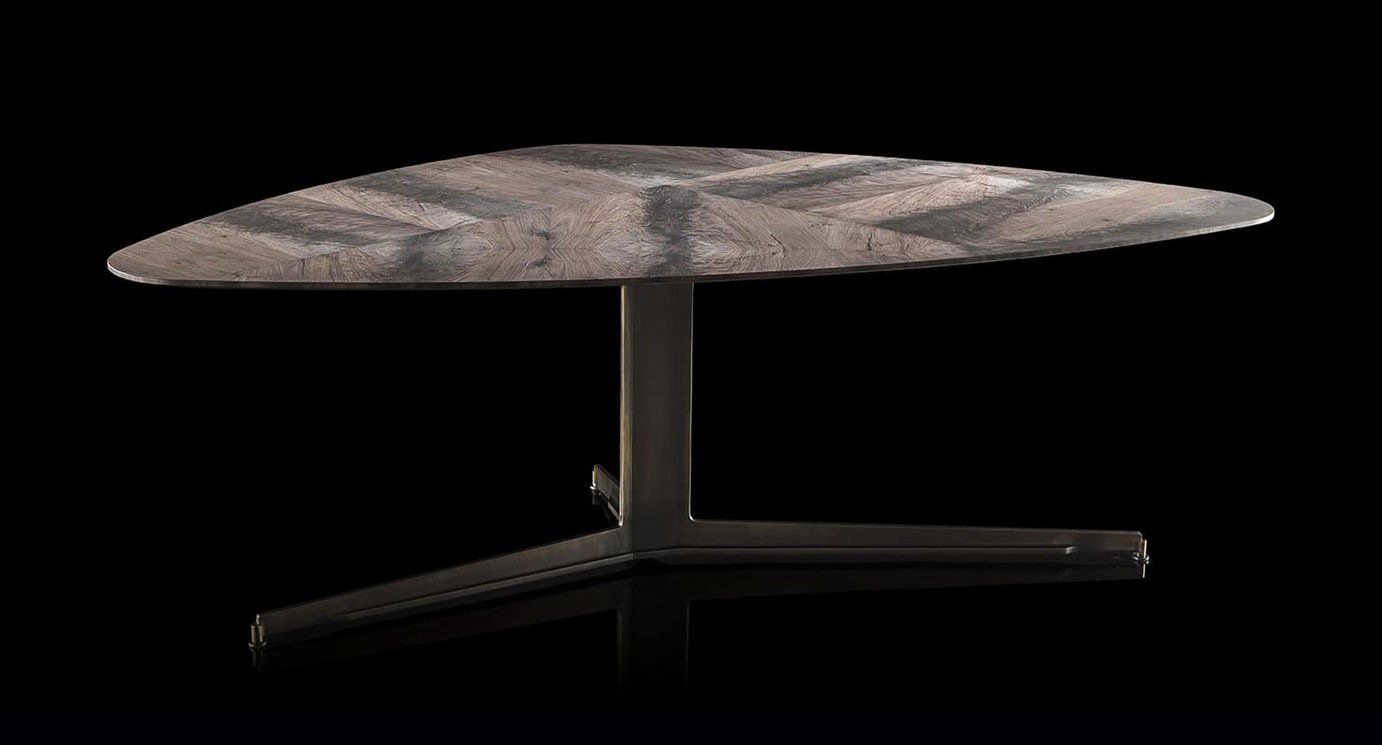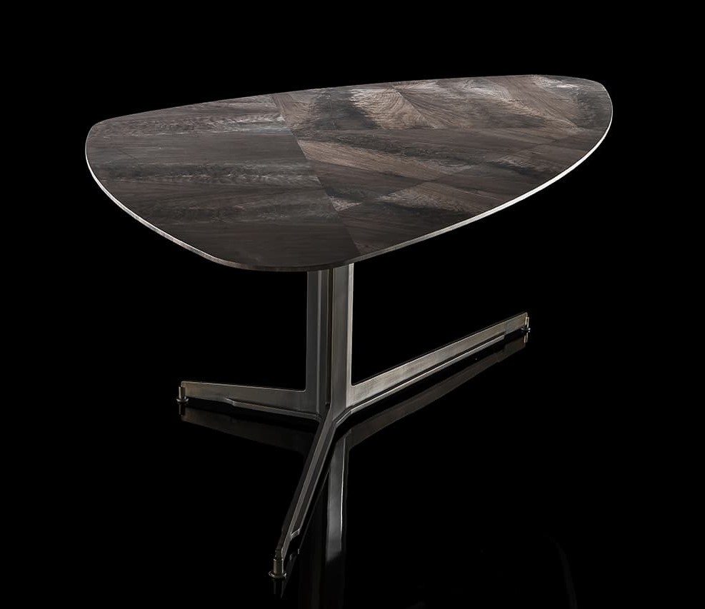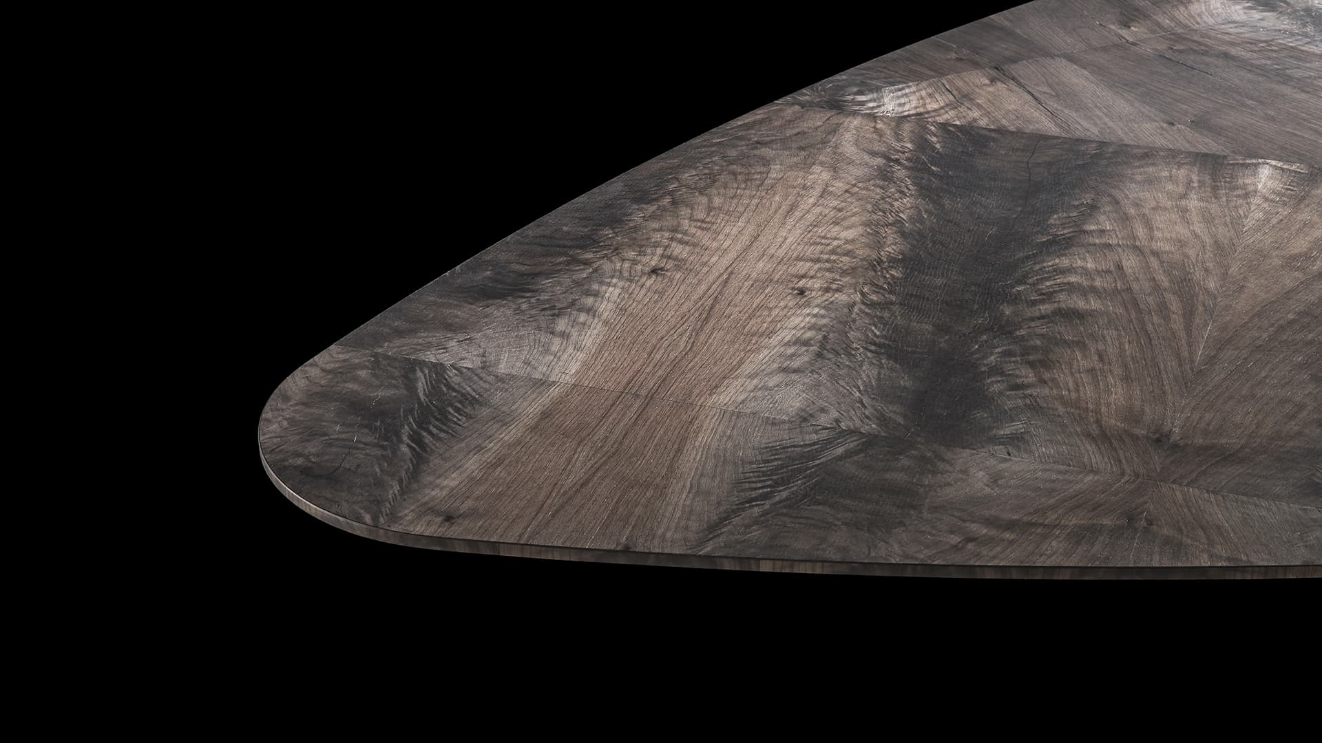 Столешница изготовлена из шпона неправильной формы. Для её создания использовался материал, который придаёт изделию уникальность и особый шарм. Толщина столешницы превышает 2 сантиметра, что делает её надёжной и долговечной. Такая конструкция позволяет равномерно распределять вес и предотвращает прогибание поверхности.