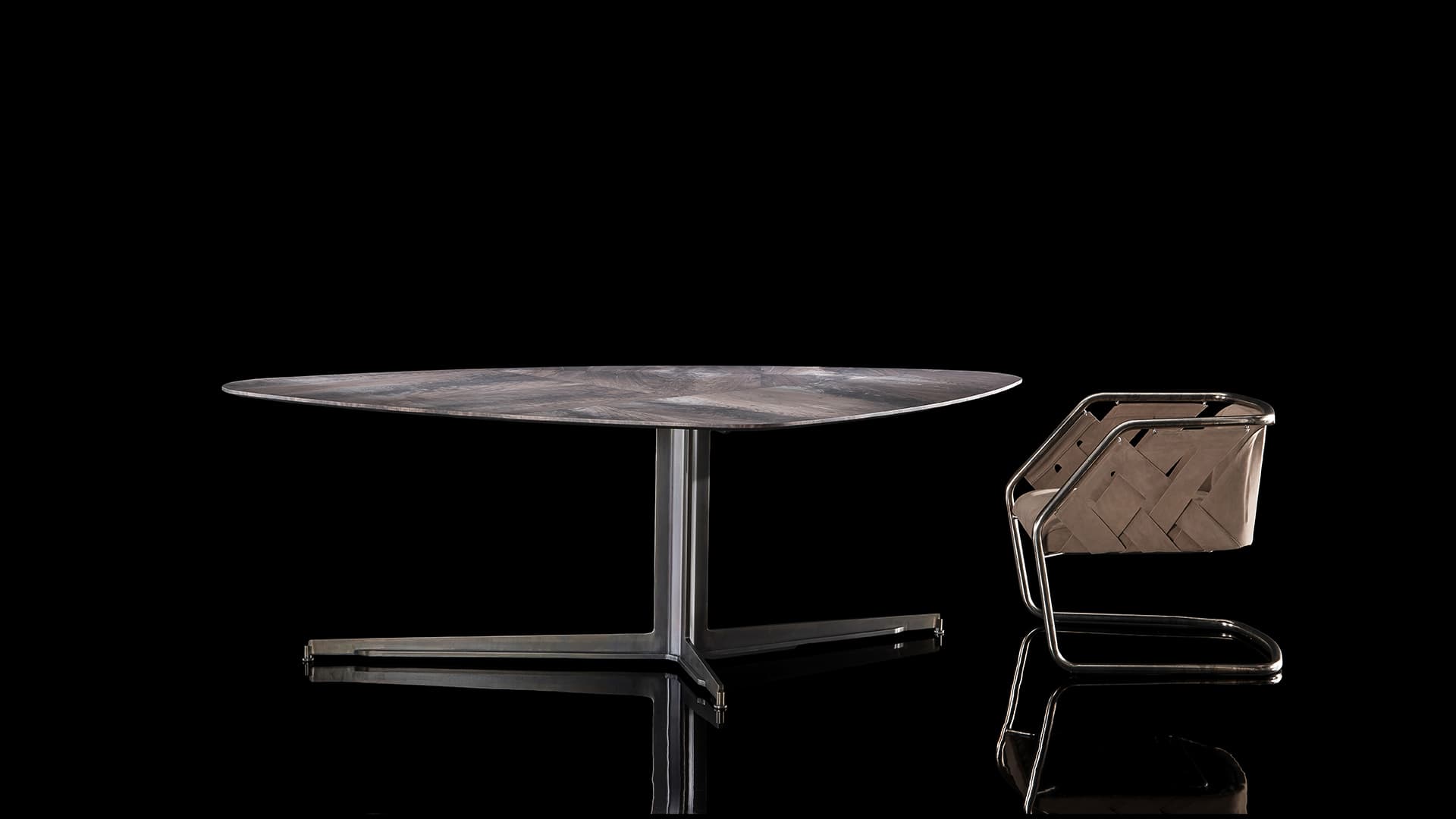 Этот столик сочетает изящество и современный стиль. Его столешница опирается на центральную ножку, от которой отходят три тонкие и длинные опоры. Такая конструкция делает столик лёгким и элегантным. Ножки изготовлены из металла, покрытого полированной чёрной сталью. Это придаёт изделию блеск и обеспечивает долговечность. Покрытие защищает металл от коррозии и придаёт поверхности ухоженный вид.