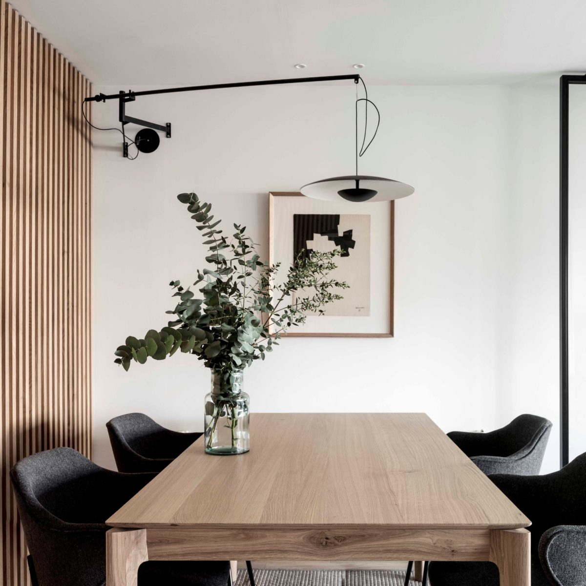 Корпус лампы выполненный из литого алюминия, обеспечивает прочность и долговечность конструкции. Металлический каркас с матовым чёрным покрытием придаёт светильнику утончённый и современный вид. Особое внимание привлекает подвижный кронштейн из углеродного волокна, также покрытый матовым чёрным лаком. Это решение позволяет удобно регулировать положение лампы. Оно обеспечивает комфортное освещение в любом месте комнаты.