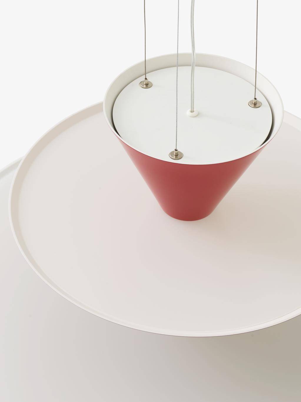 Каждый абажур — тонкий диск из алюминия, вытянутый вручную в идеальную кривую, словно капля, застывшая в полёте. Диски слоены друг над другом, образуя плавный, динамичный силуэт — как звук, замерший в воздухе.