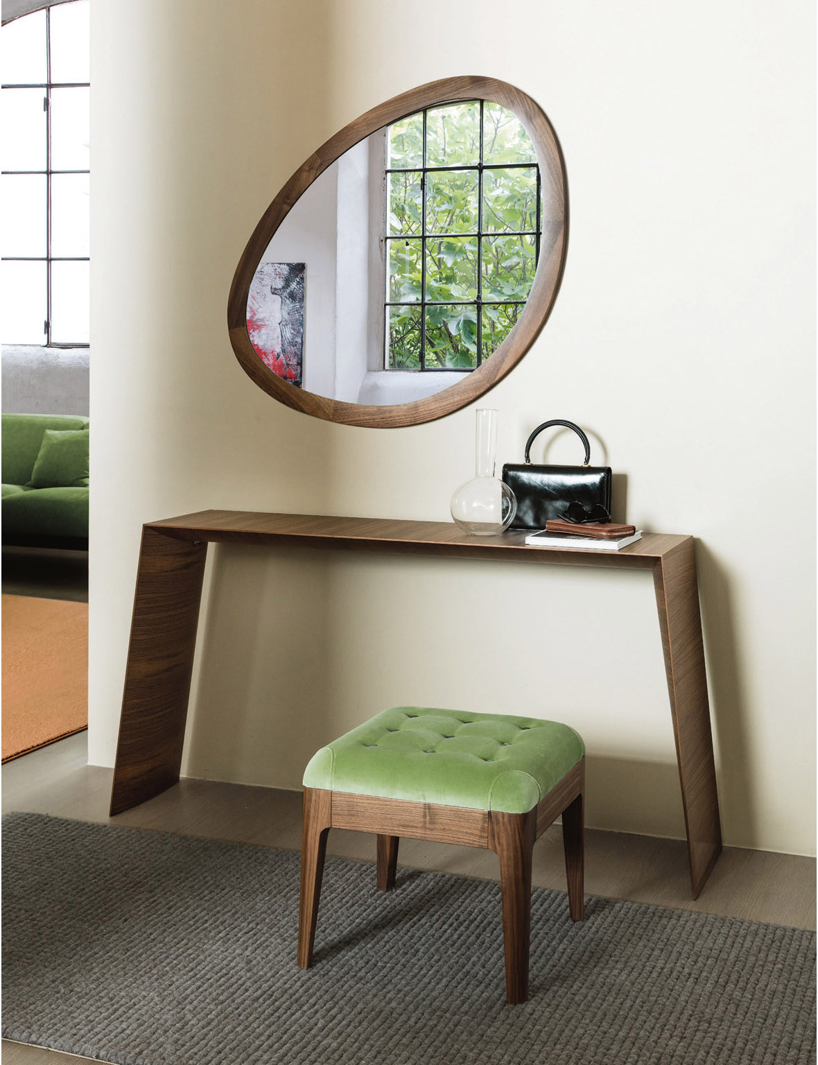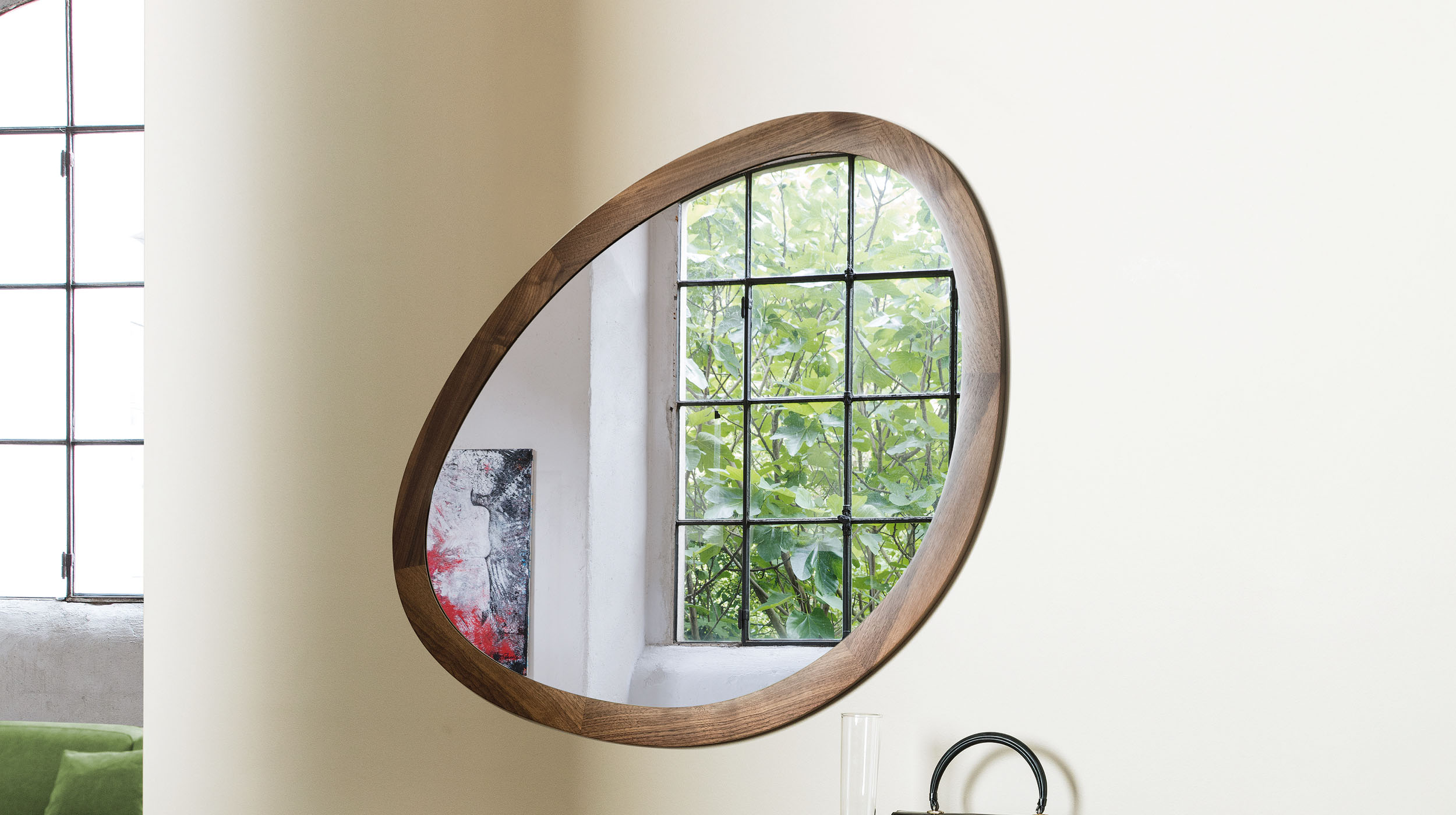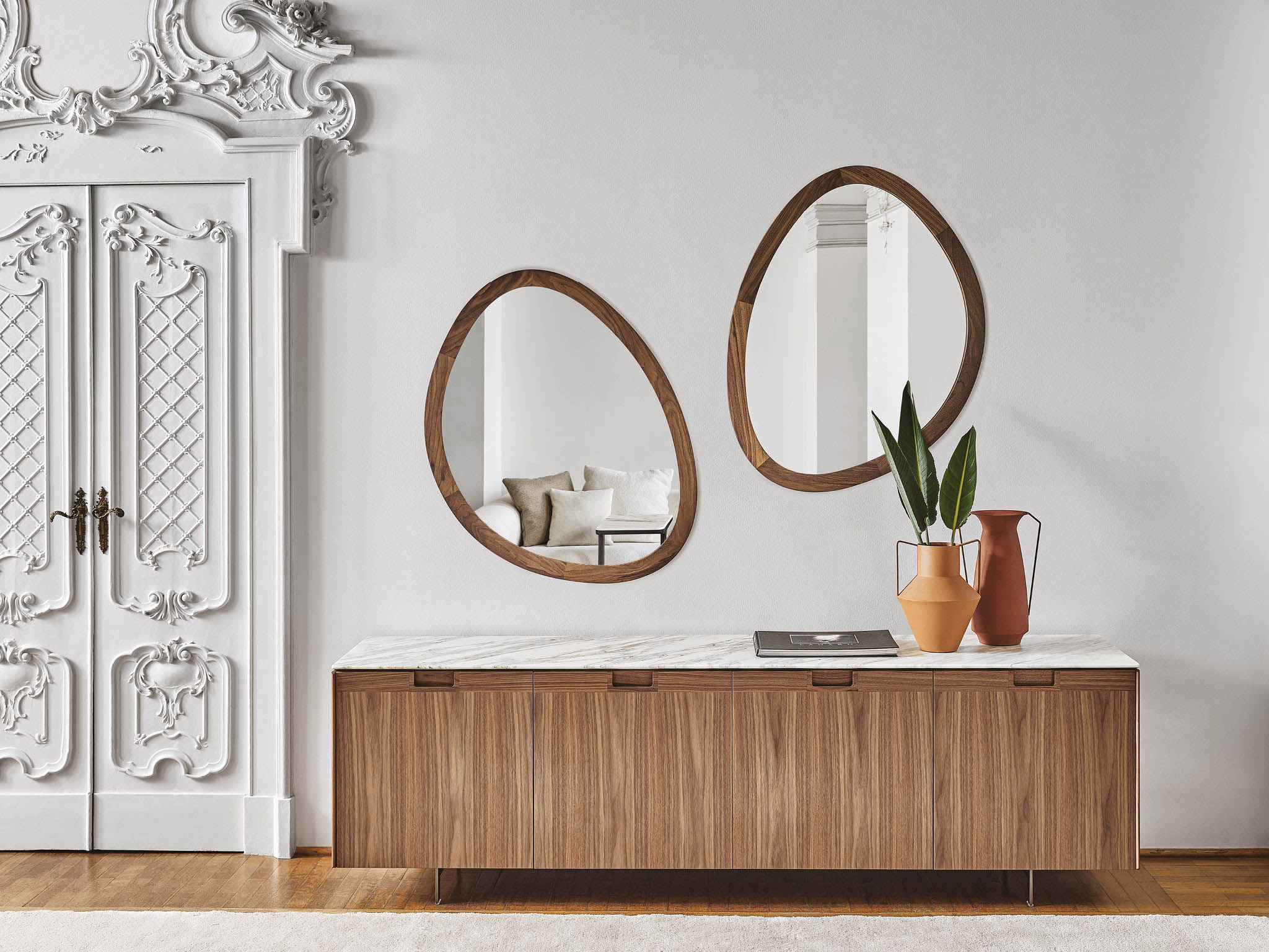 Одной из ключевых особенностей зеркала Giolino является его рама, выполненная из массива ореха Canaletta. Эта рама отличается асимметричной формой, что придает зеркалу уникальный и выразительный вид. Она доступна в нескольких цветовых вариантах, что позволяет подобрать зеркало, идеально соответствующее общему дизайну интерьера. Кроме того, раму можно покрыть лаком, украсить сусальным золотом или серебром, что добавляет изделию элегантности и изысканности.