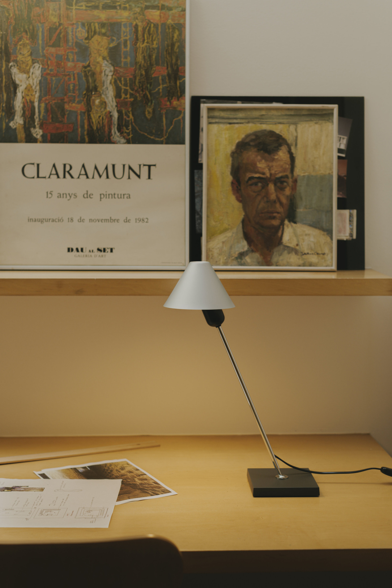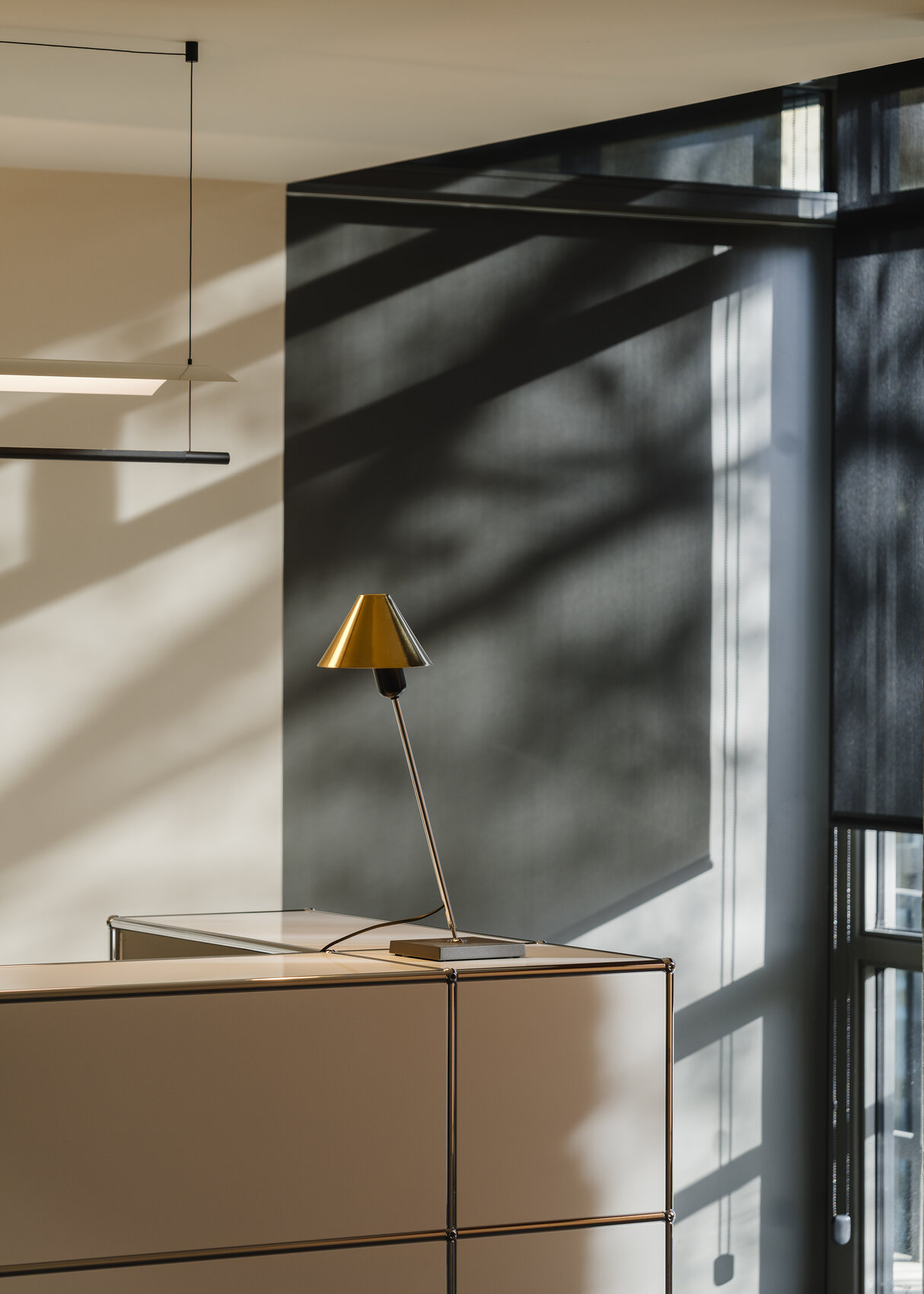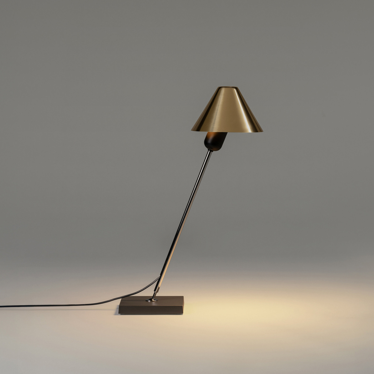 Светильник Gira table привлекает сдержанной элегантностью. Его силуэт выстраивается из чётких геометрических форм: квадратное основание, лаконичные линии кронштейна и конусообразный абажур. Серое металлическое основание придаёт модели устойчивость, не перегружая пространство.