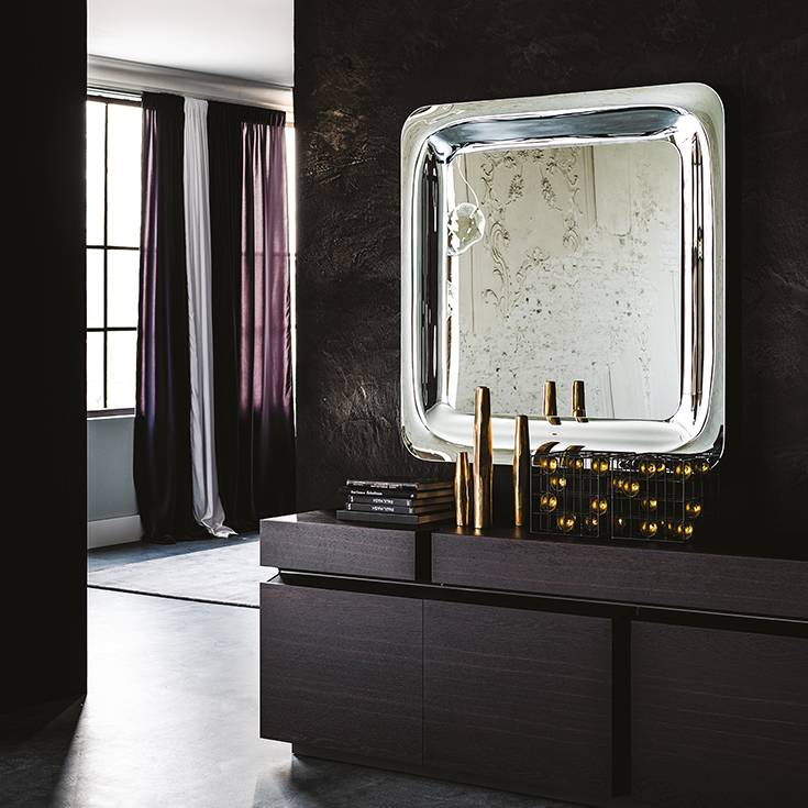 Модель отличается исключительной универсальностью: доступная в нескольких размерах и изысканных цветовых вариантах, она может использоваться как в качестве классического квадратного настенного зеркала, так и в роли вертикального напольного — достаточно повернуть его на 90 градусов при размещении, чтобы получить выразительный горизонтальный акцент.